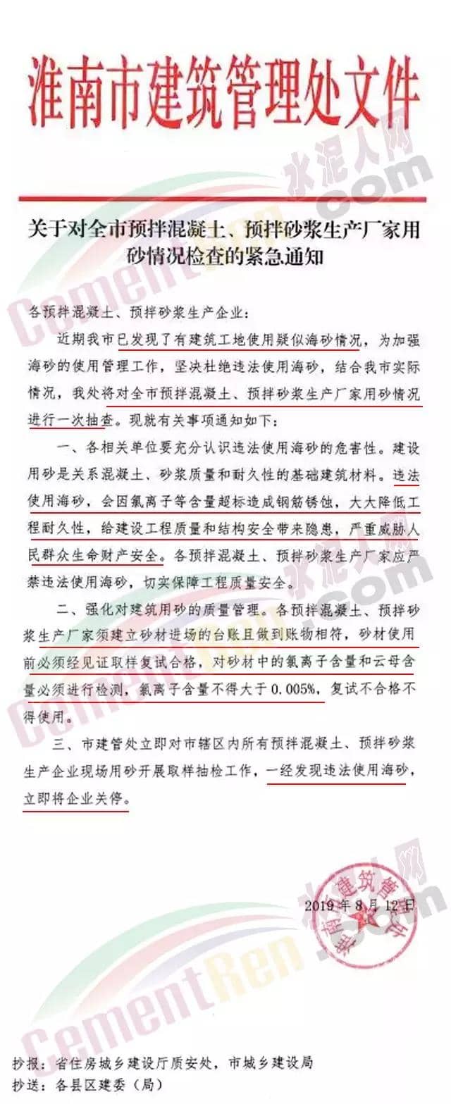 《通知》要求,各相關(guān)單位要充分認(rèn)識違法使用海砂的危害性。建設(shè)用砂是關(guān)系混凝土、砂漿質(zhì)量和耐久性的基礎(chǔ)建筑材料。違法使用海砂,會因氯離子超標(biāo)造成鋼筋銹蝕,大大降低工程耐久性,給建設(shè)工程質(zhì)量和結(jié)構(gòu)安全帶來隱患,嚴(yán)重威脅群眾生命財(cái)產(chǎn)安全。各預(yù)拌混凝土、預(yù)拌砂漿生產(chǎn)廠家應(yīng)嚴(yán)禁違法使用海砂,切實(shí)保障工程安全。強(qiáng)化對建筑用砂的管理。各預(yù)拌混凝土、預(yù)拌砂漿生產(chǎn)廠家須建立砂材進(jìn)場的臺賬且做到賬物相符,砂材使用前必須經(jīng)見證取樣復(fù)試合格,對砂材中的氯離子含量和云母含量必須進(jìn)行檢測,氯離子含量不得大于0.005%,復(fù)試不合格不得使用?;茨鲜薪ü芴幜⒓磳κ休爡^(qū)內(nèi)所有預(yù)拌混凝土、預(yù)拌砂漿生產(chǎn)企業(yè)現(xiàn)場用砂開展取樣抽檢工作,一經(jīng)發(fā)現(xiàn)違法使用海砂,立即將企業(yè)關(guān)停。