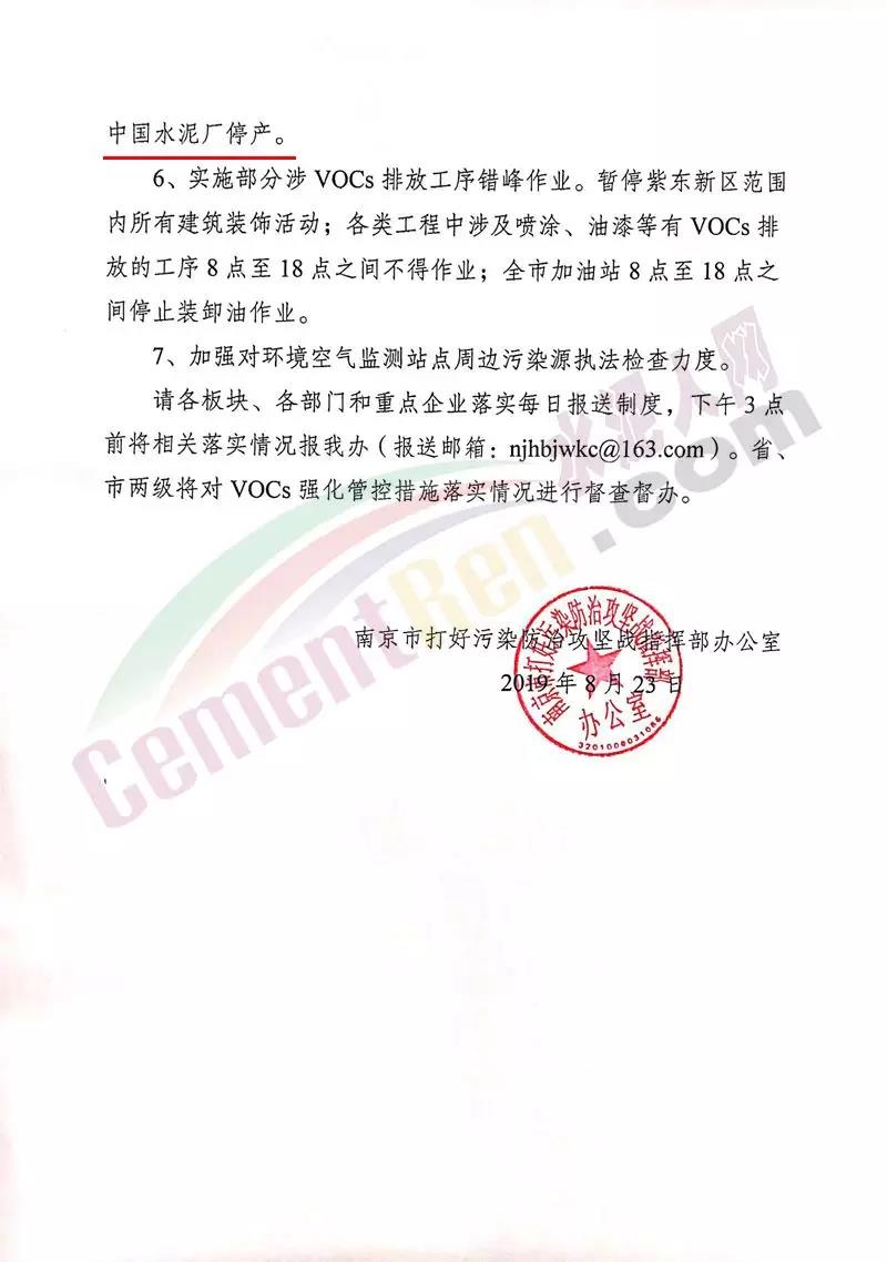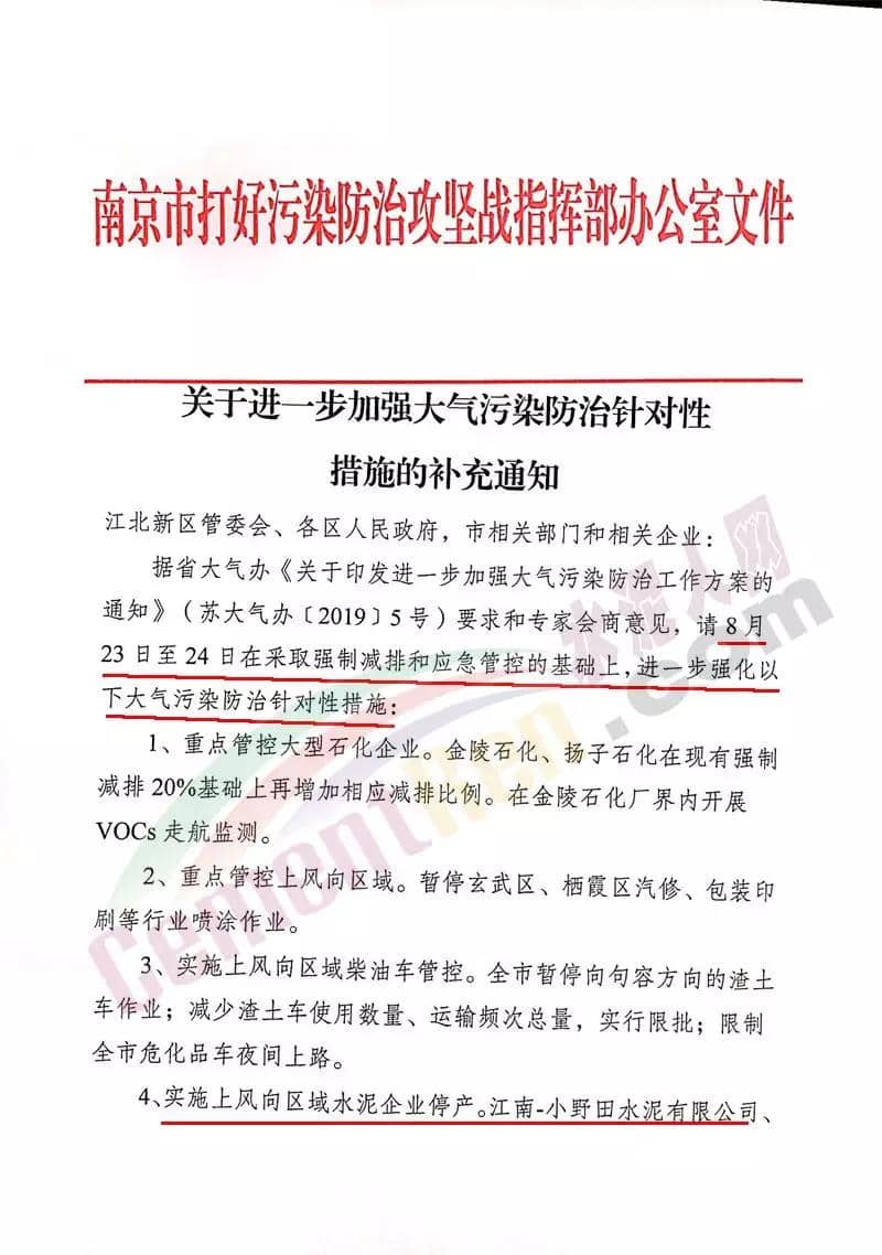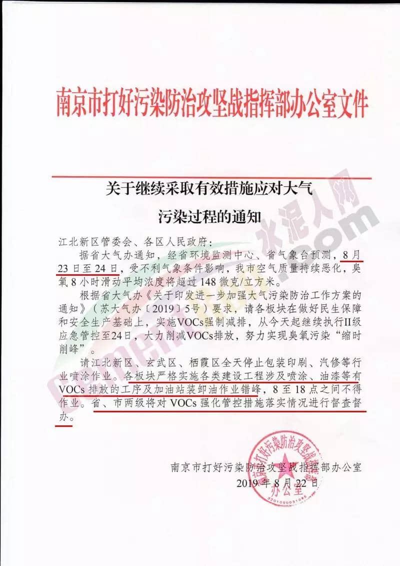 據(jù)水泥人網了解,就在前一日(8月22日),南京市打好污染防治攻堅戰(zhàn)指揮部辦公室發(fā)布《關于繼續(xù)采取有效措施應對大氣污染過程的通知 》稱據(jù)省大氣辦通知,經省環(huán)境監(jiān)測中心、省氣象臺預測,8月23日至24日,受不利氣象條件影響,市空氣質量持續(xù)惡化,臭氧8小時滑動平均濃度將超過148微克/立方米。根據(jù)省大氣辦《關于印發(fā)進一步加在氣污染防治工作方案的通知》要要求,請各板塊在做好民生保障和安全生產基礎上實施強制減排,從22日起繼續(xù)執(zhí)行II級應急管控至24日,努力實現(xiàn)臭氧污染“縮時削峰”。省、市兩級將對強化管控措施落實情況進行督查。