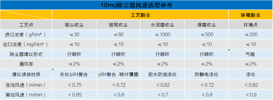 表一 10mg除塵器選型參考