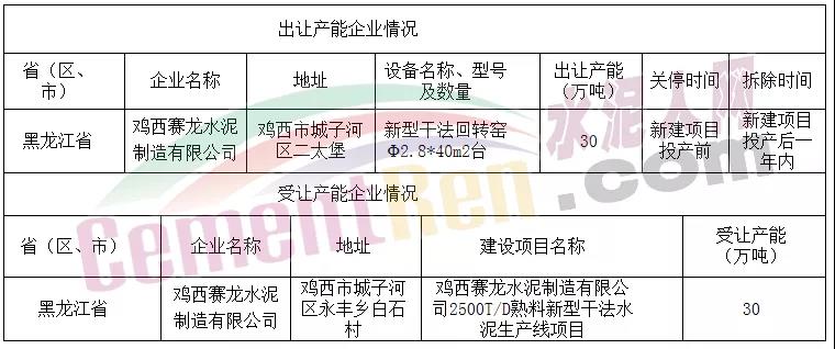 據(jù)黑龍江省工業(yè)和信息化廳發(fā)布《雞西賽龍水泥制造有限公司熟料產(chǎn)能出讓公告》稱(chēng),根據(jù)《國(guó)務(wù)院關(guān)于化解產(chǎn)能?chē)?yán)重過(guò)剩矛盾的指導(dǎo)意見(jiàn)》(國(guó)發(fā)〔2013〕41號(hào))和《國(guó)務(wù)院辦公廳關(guān)于促進(jìn)建材工業(yè)穩(wěn)增長(zhǎng)調(diào)結(jié)構(gòu)增效益的指導(dǎo)意見(jiàn)》(國(guó)辦發(fā)〔2016〕34號(hào))精神,按照《工業(yè)和信息化部關(guān)于印發(fā)鋼鐵水泥玻璃行業(yè)產(chǎn)能置換實(shí)施辦法的通知》(工信部原〔2017〕337號(hào))要求,現(xiàn)將雞西賽龍水泥制造有限公司出讓水泥熟料產(chǎn)能情況予以公告,歡迎社會(huì)公眾進(jìn)行監(jiān)督?! ?br />