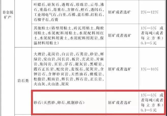 據(jù)此前《中華人民共和國資源稅法(征求意見稿)》透露內容顯示:對砂石(天然砂、卵石、機制砂石)征收1%-5%或者1元-10元/立方米資源稅。稅法規(guī)定對衰竭期礦山開采的礦產(chǎn)品減征30%資源稅,授權各省對低品位礦減免資源稅。