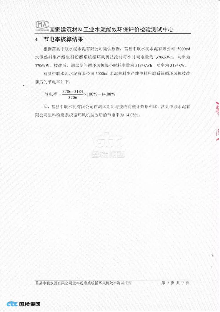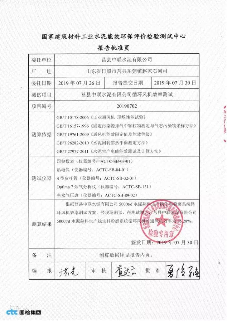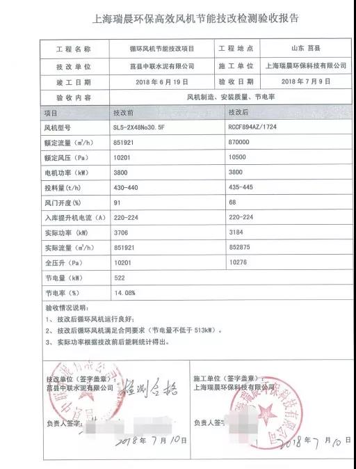 2019年7月29日,國(guó)家建筑材料工業(yè)水泥能效環(huán)保評(píng)價(jià)檢驗(yàn)測(cè)試中心對(duì)莒縣中聯(lián)水泥有限公司生料磨系統(tǒng)循環(huán)風(fēng)機(jī)進(jìn)行了現(xiàn)場(chǎng)測(cè)試,測(cè)試結(jié)果表示瑞晨技改后的風(fēng)機(jī)效率為85.28%,節(jié)電率為14.08%。