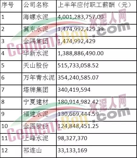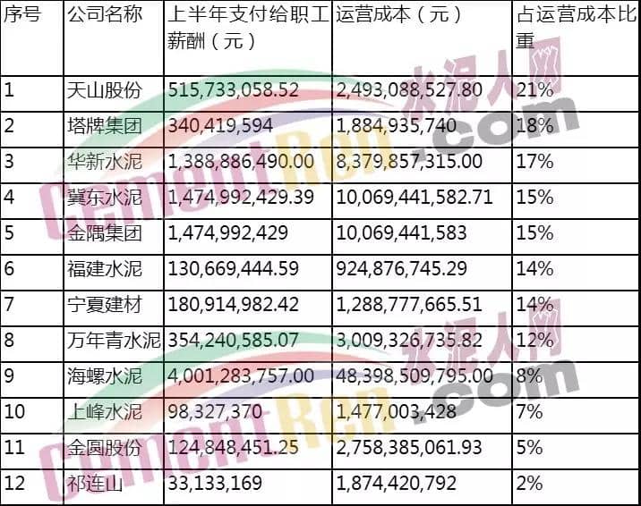 員工的薪酬支出一直被認(rèn)為是企業(yè)成本上漲的主要因素, 2019年上半年各大水泥集團(tuán)公司職工薪酬占運(yùn)營(yíng)成本的占比,從已公布的數(shù)據(jù)來看,天山股份的占比最高,達(dá)到21%,其它水泥企業(yè)基本都保持在15%左右,最低的是祁連山水泥,僅占運(yùn)營(yíng)成本的2%。海螺水泥以40億元支付職工薪酬排名總量第一。