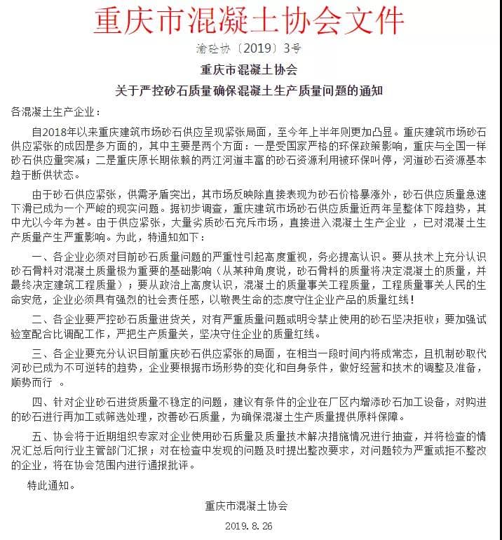 其五、重慶混凝土協(xié)會將于近期組織專家對企業(yè)使用砂石質(zhì)量及質(zhì)量技術(shù)解決措施情況進(jìn)行抽查,并將檢查的情況匯總后向行業(yè)主管部門匯報;對在檢查過程中存在的問題及時提出整改要求,對問題較為嚴(yán)重或拒不整改的企業(yè),將在協(xié)會范圍內(nèi)進(jìn)行通報批評。原文如下: