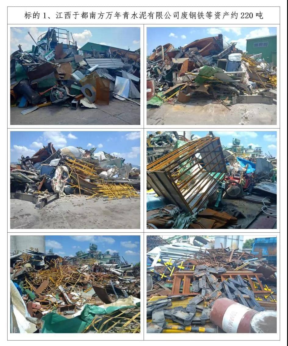 標(biāo)的1:江西于都南方萬(wàn)年青水泥有限公司擁有的廢鋼鐵等資產(chǎn)約220噸,起拍價(jià)1700元/噸。