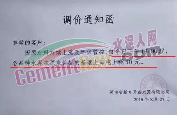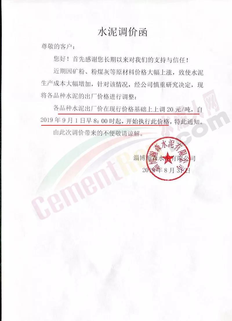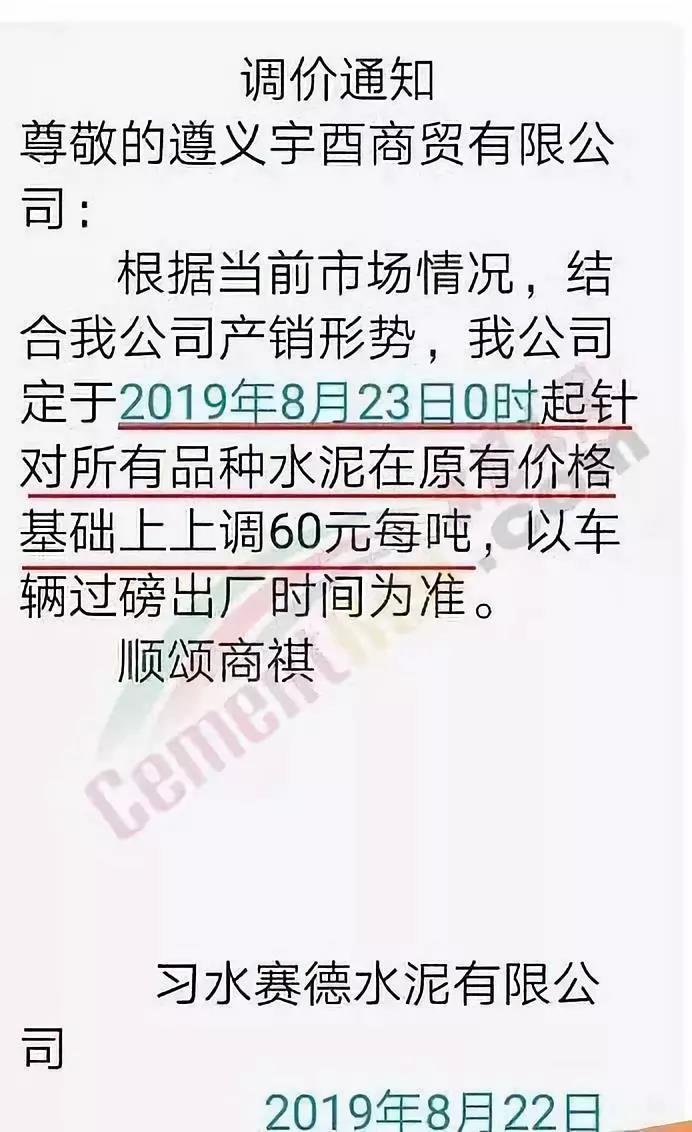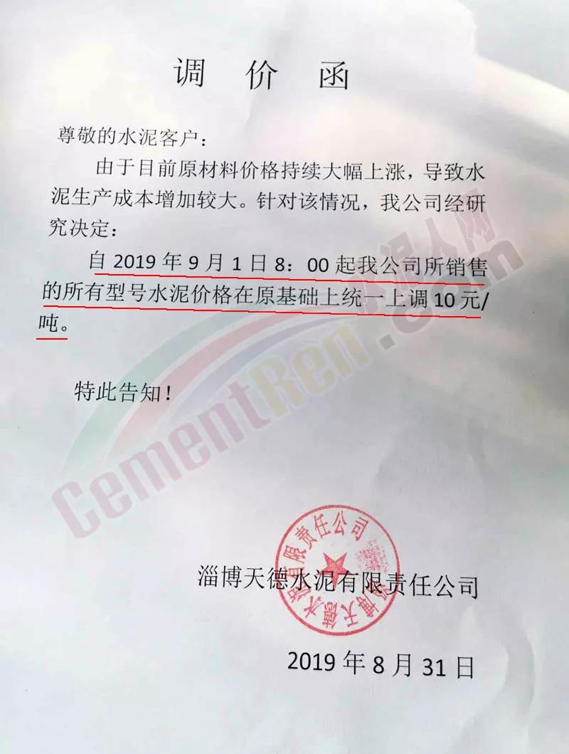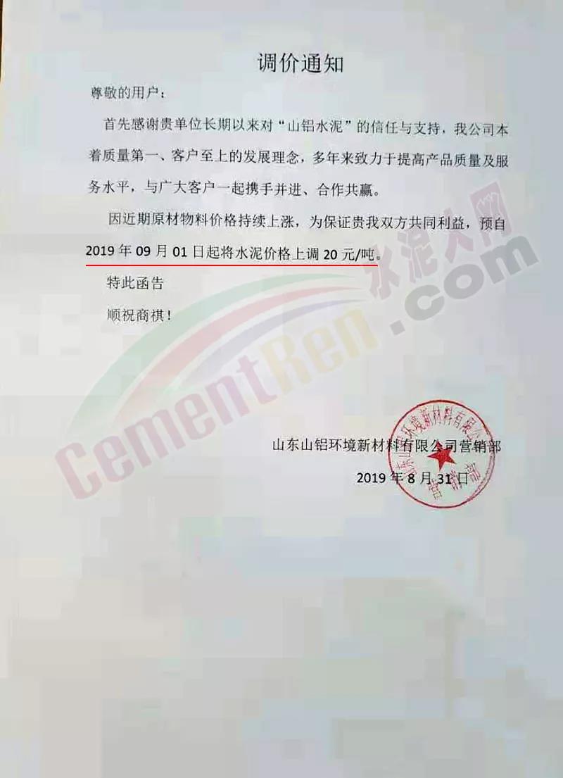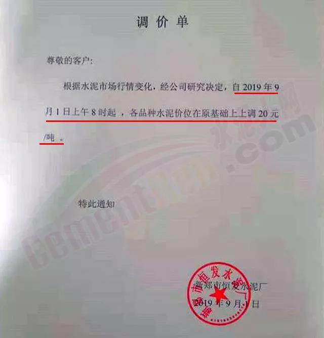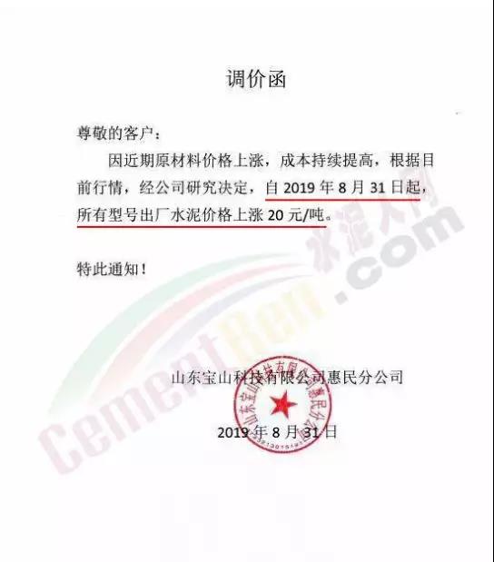 鄭州順寶水泥股份有限公司調(diào)價函稱:因原材料持續(xù)上漲和外部等因素影響,經(jīng)公司研究決定,自2019年9月1日7:30起,各品種水泥在原價格基礎(chǔ)上,統(tǒng)一上調(diào)20元/噸。