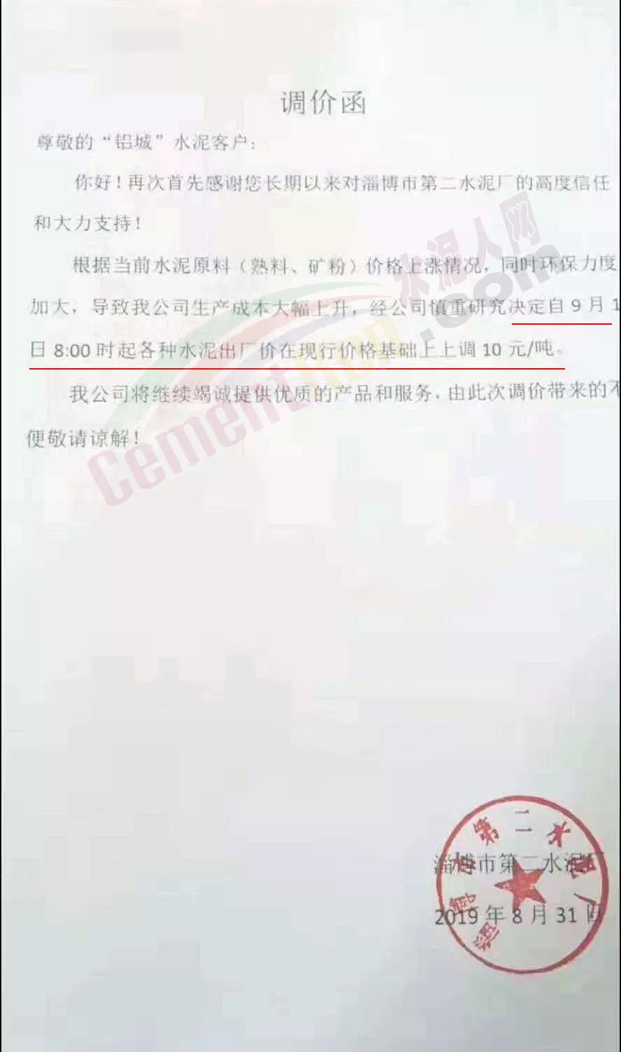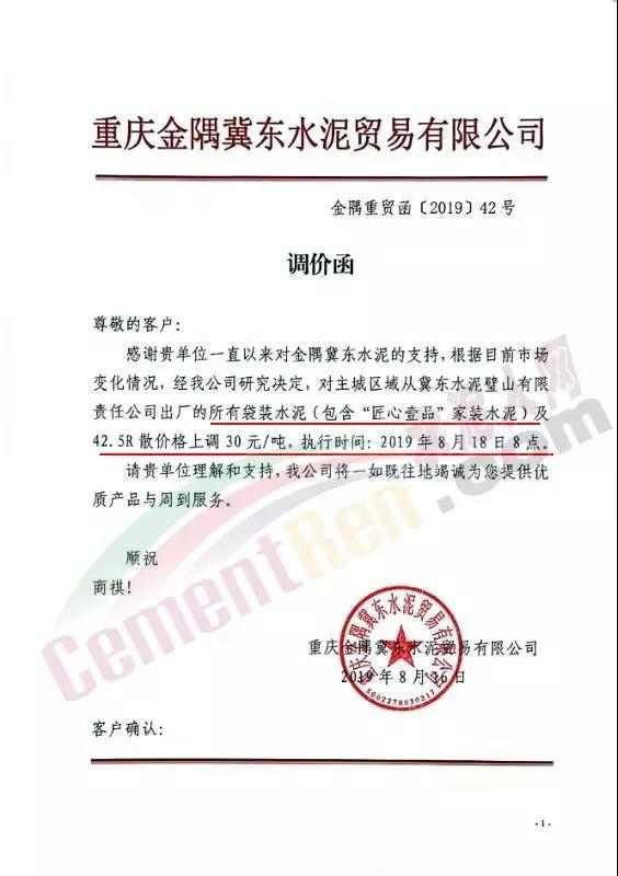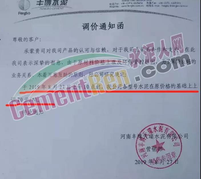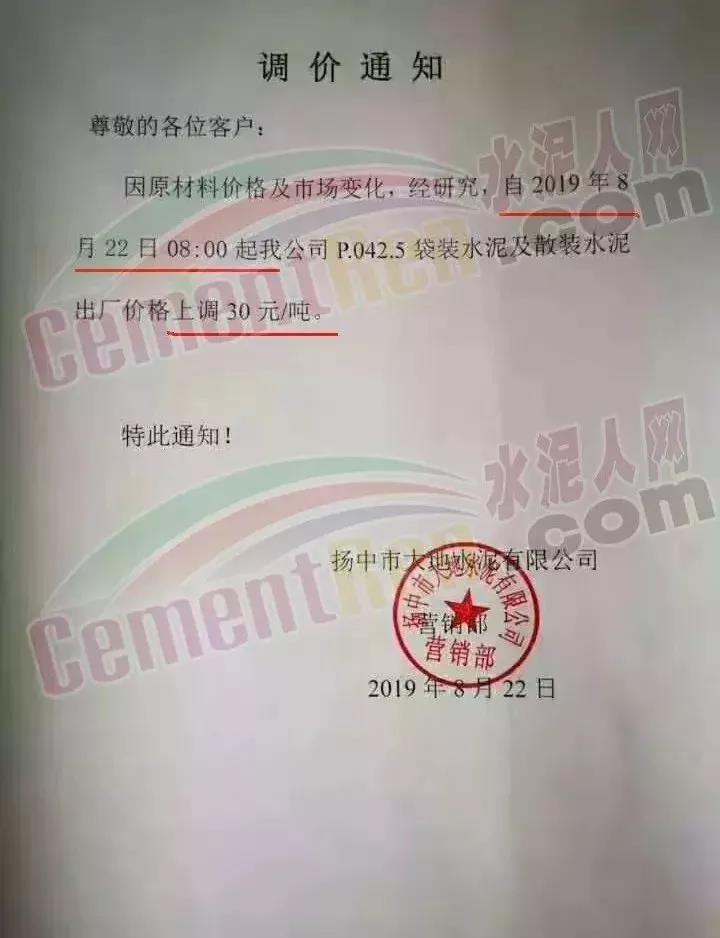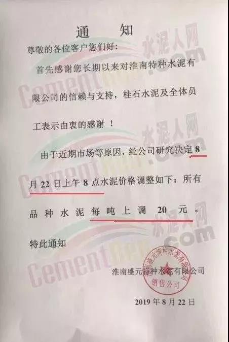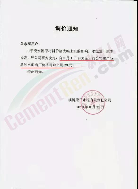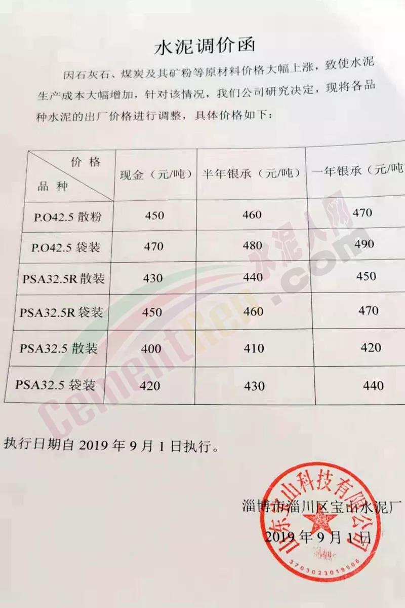 鄭州順寶水泥股份有限公司調(diào)價函稱:因原材料持續(xù)上漲和外部等因素影響,經(jīng)公司研究決定,自2019年9月1日7:30起,各品種水泥在原價格基礎(chǔ)上,統(tǒng)一上調(diào)20元/噸。