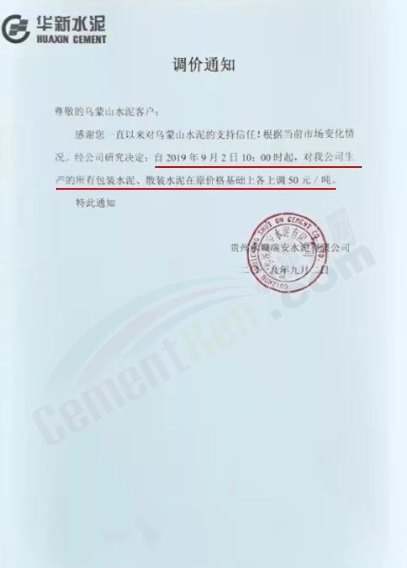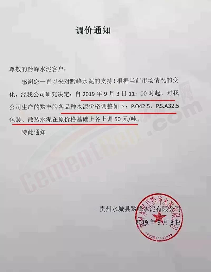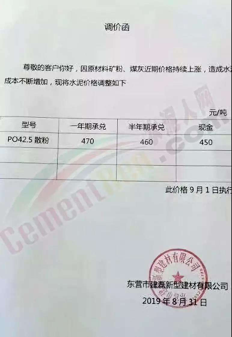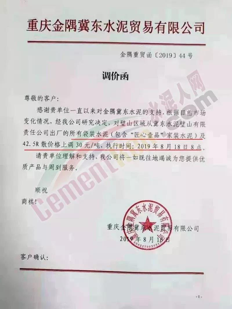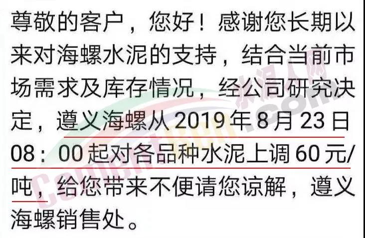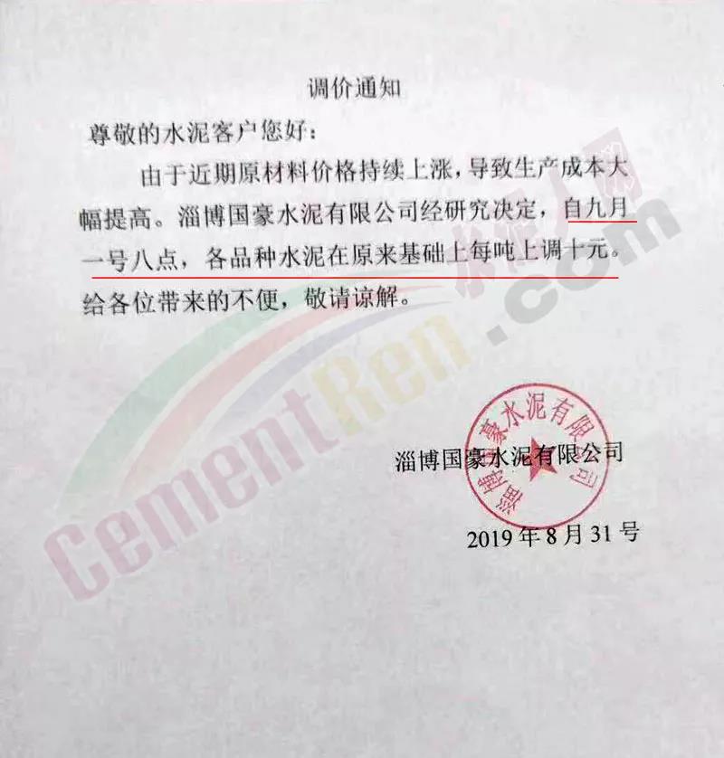 鄭州順寶水泥股份有限公司調(diào)價函稱:因原材料持續(xù)上漲和外部等因素影響,經(jīng)公司研究決定,自2019年9月1日7:30起,各品種水泥在原價格基礎(chǔ)上,統(tǒng)一上調(diào)20元/噸。