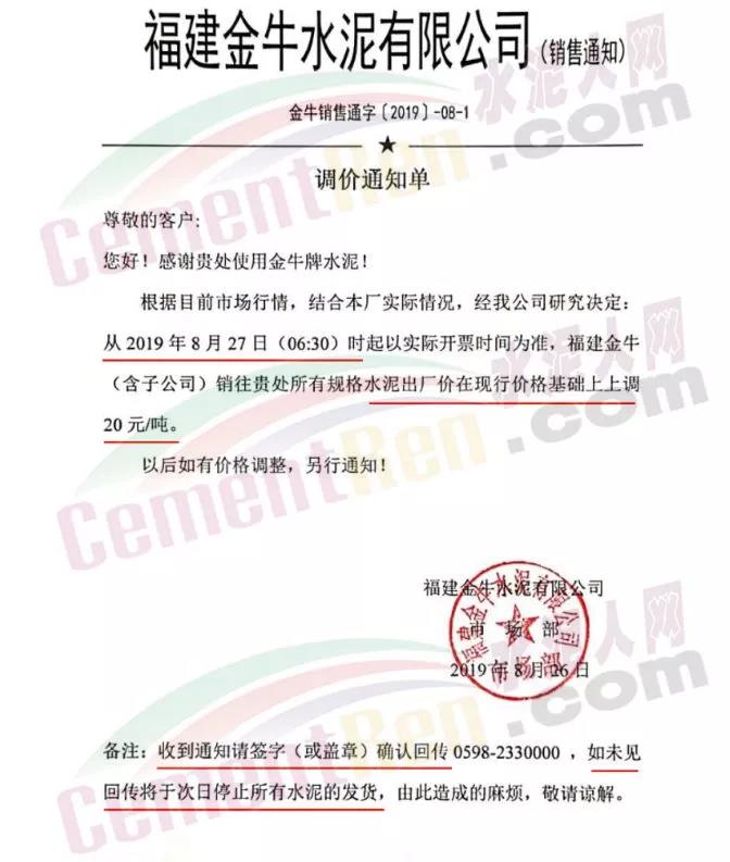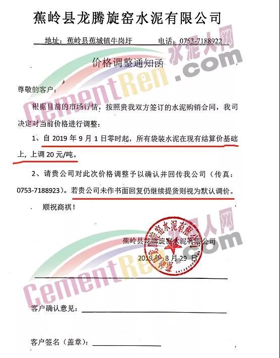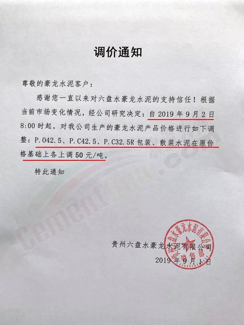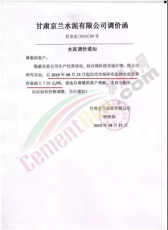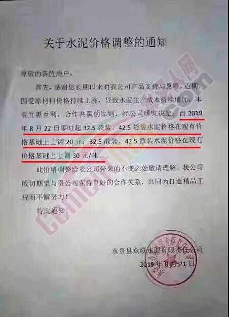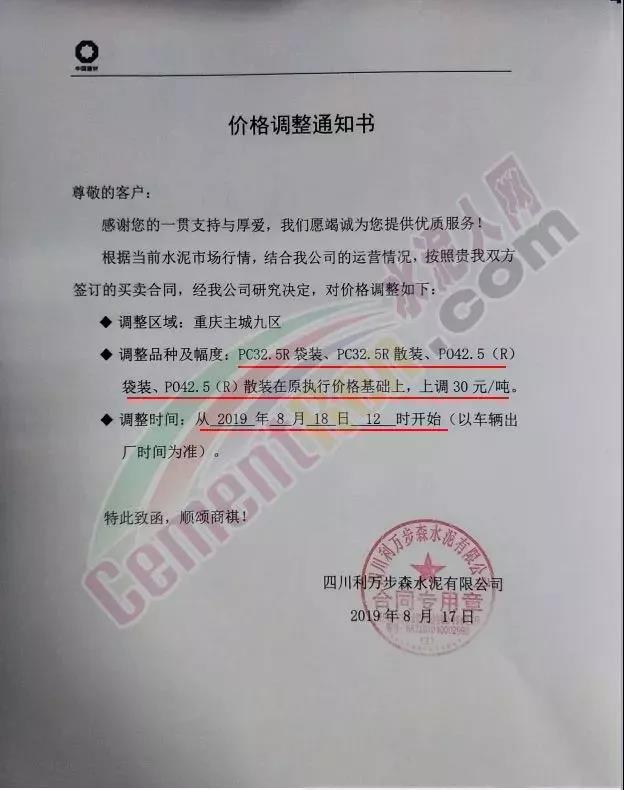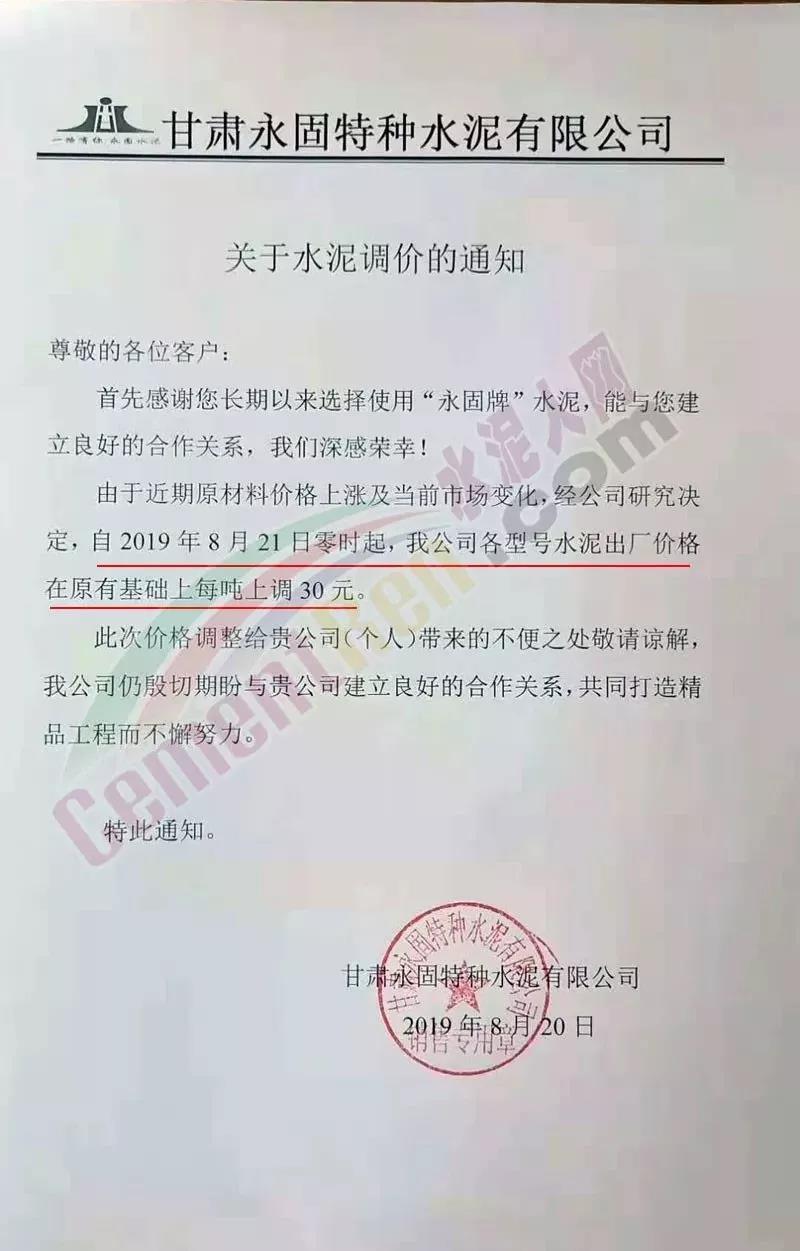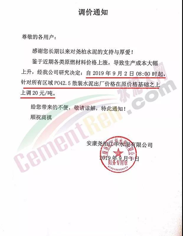 經(jīng)公司研究決定,自2019年09月01日0:00時起,各品種等級袋裝水泥在原價格基礎(chǔ)上每噸上調(diào)20元。敬請知悉。