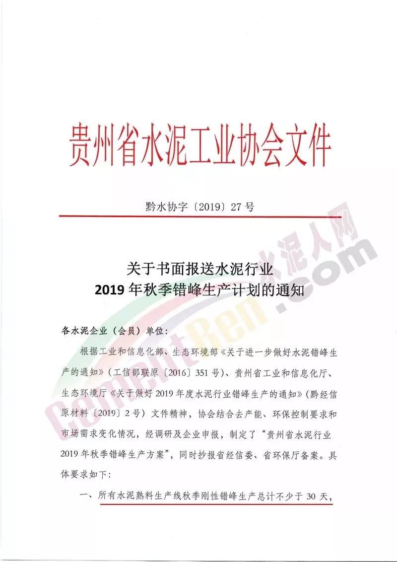 就在上個月初,由于貴州地區(qū)水泥價格一直低位運(yùn)行,水泥出廠價格低至200元/噸以下,當(dāng)?shù)孛耖g就傳出未來一個月貴州地區(qū)水泥價格將整體上漲100元/噸,價格調(diào)整到300元/噸,隨后不久貴州省水泥工業(yè)協(xié)會印發(fā)了“2019年秋季錯峰生產(chǎn)方案”,要求所有水泥熟料生產(chǎn)線秋季剛性錯峰生產(chǎn)總計(jì)不少于30天,原則上每月錯峰生產(chǎn)10天每窯。