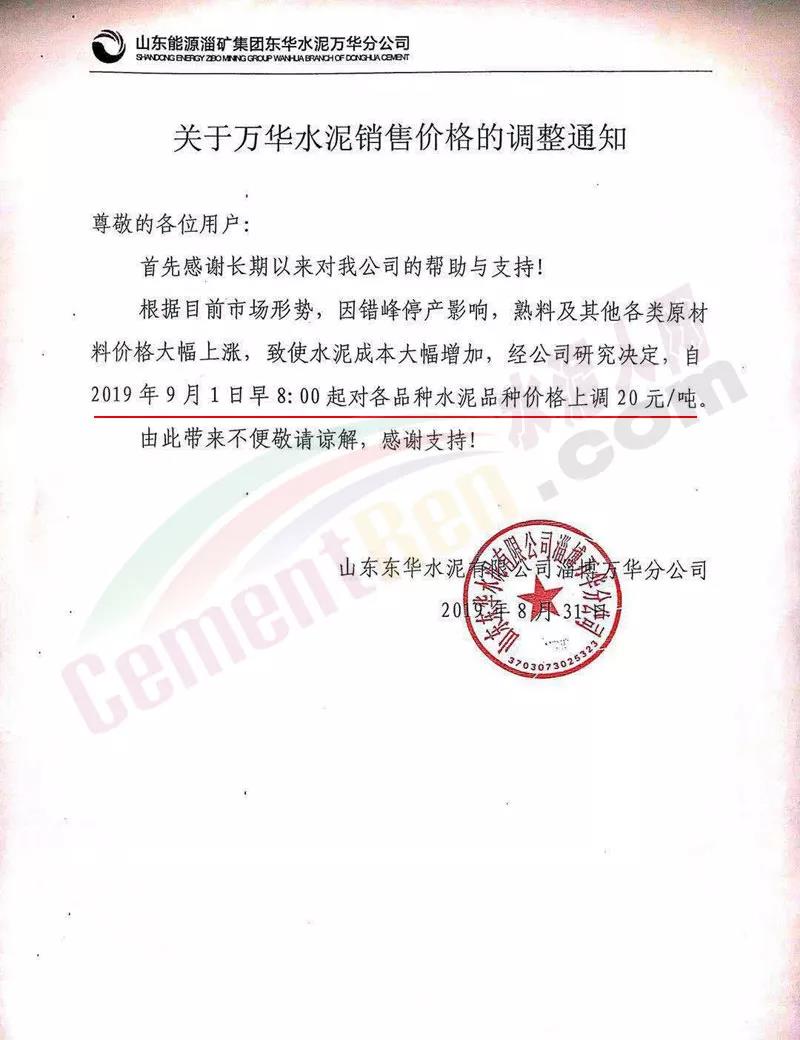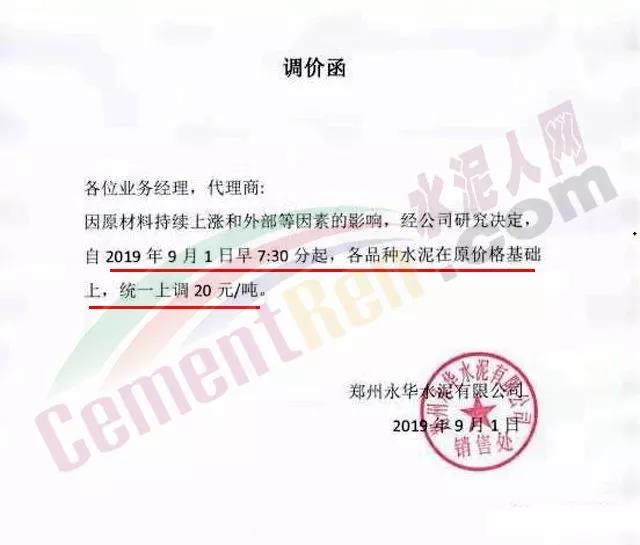 鄭州永華水泥有限公司發(fā)布調(diào)價函稱因原材料持續(xù)上漲和外部等因素影響,經(jīng)公司研究決定,自2019年9月1日7:30起,各品種水泥在原價格基礎(chǔ)上,統(tǒng)一上調(diào)20元/噸。