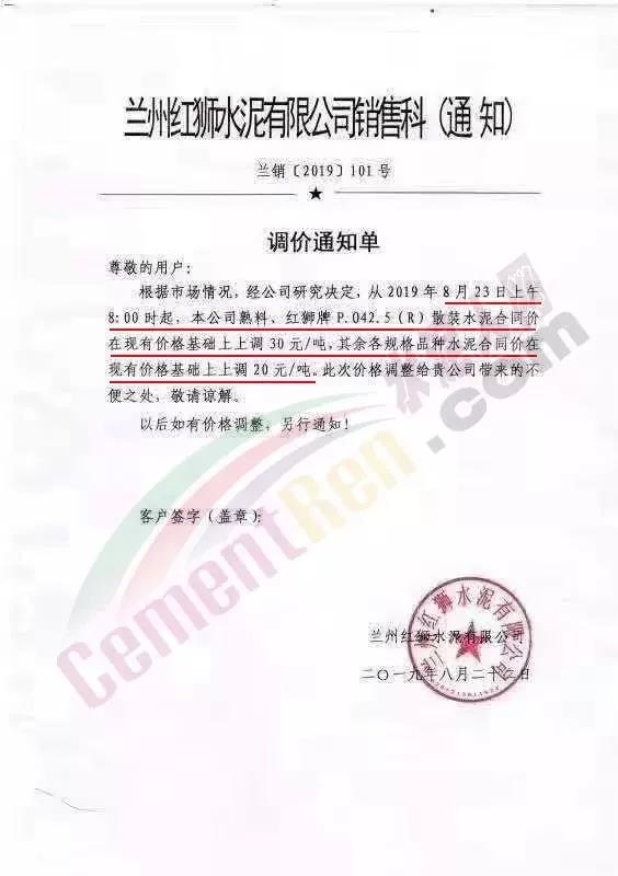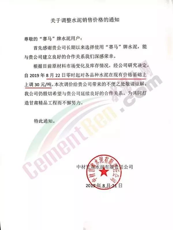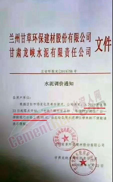 中材甘肅水泥有限責(zé)任公司《關(guān)于調(diào)整水泥銷售價格的通知》稱自2019年8月22日零時起對各品種水泥在現(xiàn)有價格基礎(chǔ)上上調(diào)30元/噸。