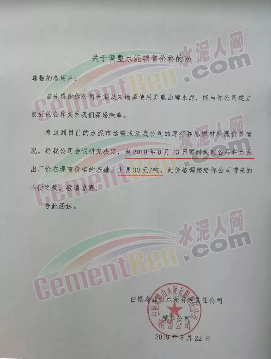 根據(jù)當(dāng)前市場形勢經(jīng)我公司研究決定,自2019年08月22日上午9:00點(diǎn)起所有水泥品種價格統(tǒng)一上調(diào)30元/噸。