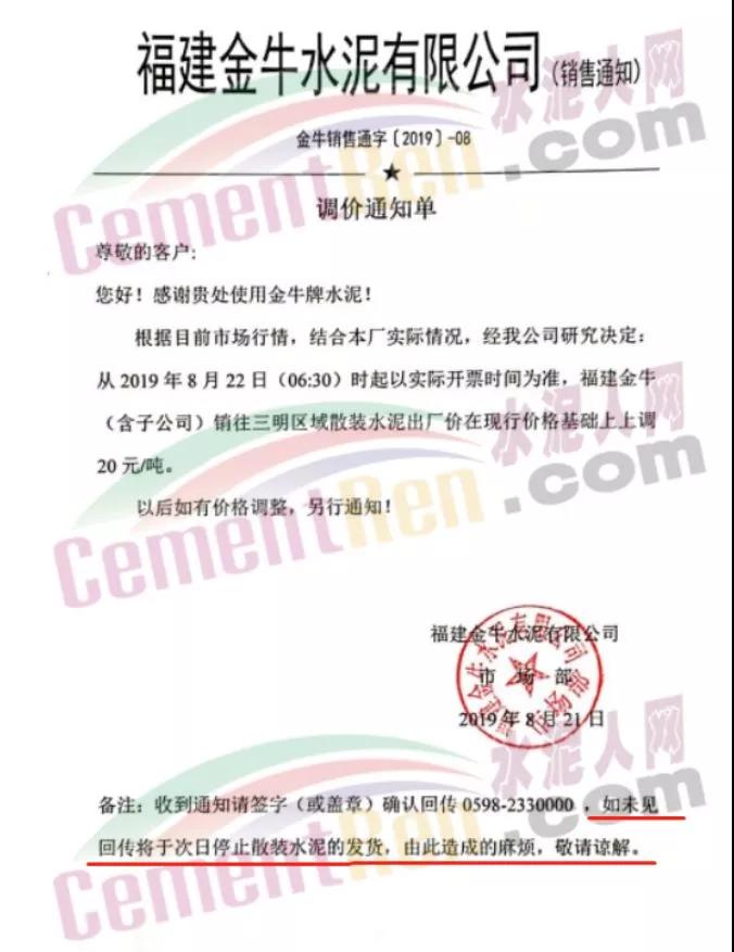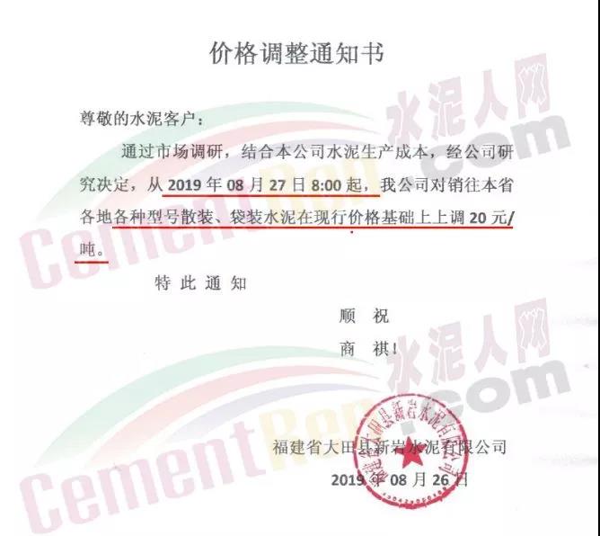 8月26日,福建省大田縣新巖水泥有限公司發(fā)布價格調(diào)通知稱:通過市場調(diào)研,結(jié)合本公司水泥生產(chǎn)成本,經(jīng)公司研究決定,從2019年8月27日8:00起,我公司對銷往本省各地各種型號散裝、袋裝水泥在現(xiàn)行價格基礎(chǔ)上上調(diào)20元/噸。