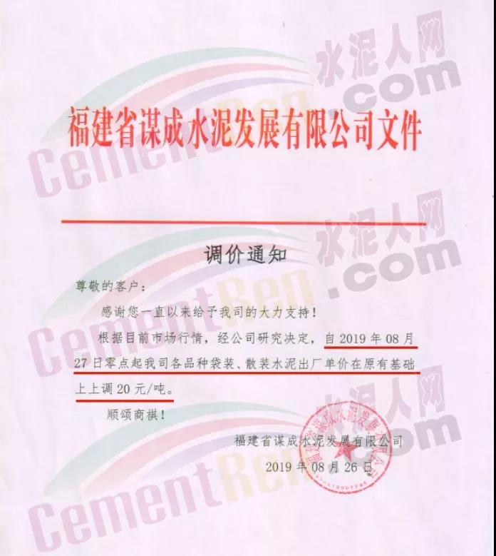 8月26日。福建省謀成水泥發(fā)展有限公司發(fā)布調(diào)價通知稱:根據(jù)目前市場行情,經(jīng)公司研究決定,自2019年8月27日零時起,我司各品種袋裝、散裝水泥出廠單價在原有基礎(chǔ)上上調(diào)20元/噸,本次調(diào)價為謀成水泥8月份的第二調(diào)價,累計(jì)上調(diào)40元/噸。