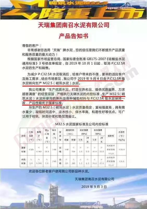9月3日天瑞集團南召水泥有限公司發(fā)布產(chǎn)品告知書稱,為減少P.C32.5R水泥取消后,給客戶帶來的不便,更高適應(yīng)客戶及施工需求,結(jié)合市場意見,公司將于9月4日由PC32.5R級水泥轉(zhuǎn)向生產(chǎn)M32.5砌筑水泥。公司將嚴格執(zhí)行天瑞水泥內(nèi)控標(biāo)準(zhǔn),生產(chǎn)M32.5水泥所用的熟料及各種輔助材料與P.C32.5R級水泥保持一致,且產(chǎn)品性能優(yōu)于國家標(biāo)準(zhǔn)。告知書原文如下: