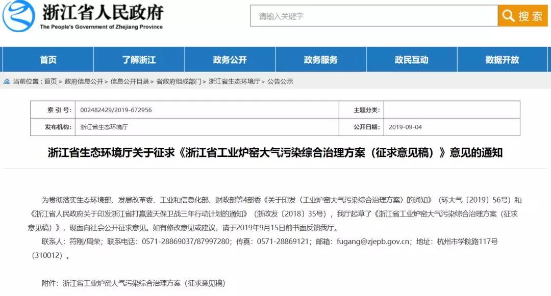 通知稱:為貫徹落實(shí)生態(tài)環(huán)境部、發(fā)展改革委、工業(yè)和信息化部、財(cái)政部等4部委《關(guān)于印發(fā)〈工業(yè)爐窯大氣污染綜合治理方案〉的通知》(環(huán)大氣〔2019〕56號(hào))和《浙江省人民政府關(guān)于印發(fā)浙江省打贏藍(lán)天保衛(wèi)戰(zhàn)三年行動(dòng)計(jì)劃的通知》(浙政發(fā)〔2018〕35號(hào)),我廳起草了《浙江省工業(yè)爐窯大氣污染綜合治理方案(征求意見(jiàn)稿)》,并面向社會(huì)公開(kāi)征求意見(jiàn)。