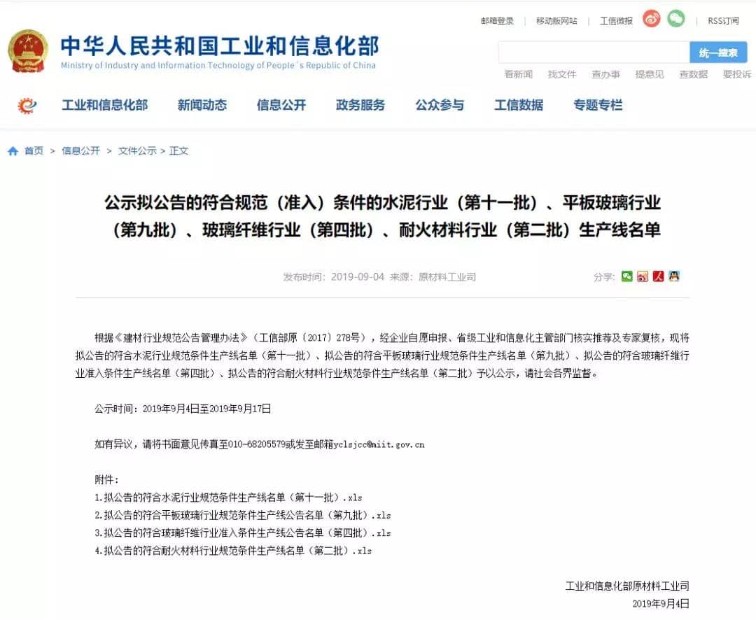 公示文件稱:根據(jù)《建材行業(yè)規(guī)范公告管理辦法》(工信部原〔2017〕278號),經(jīng)企業(yè)自愿申報、省級工業(yè)和信息化主管部門核實推薦及專家復核,現(xiàn)將擬公告的符合水泥行業(yè)規(guī)范條件生產(chǎn)線名單(第十一批)、擬公告的符合平板玻璃行業(yè)規(guī)范條件生產(chǎn)線名單(第九批)、擬公告的符合玻璃纖維行業(yè)準入條件生產(chǎn)線名單(第四批)、擬公告的符合耐火材料行業(yè)規(guī)范條件生產(chǎn)線名單(第二批)予以公示,請社會各界監(jiān)督。