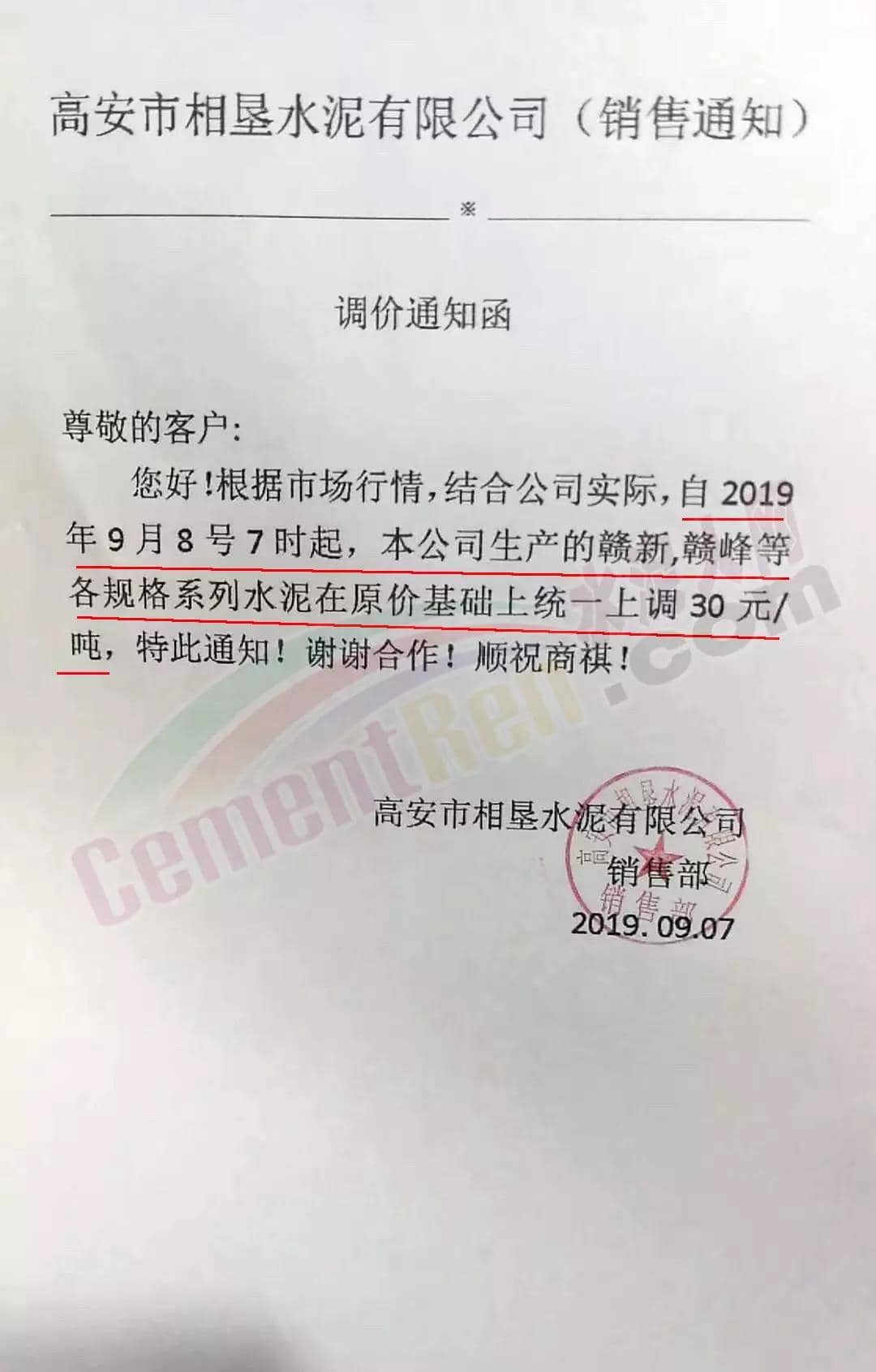 同期,分宜海螺水泥通知自9月7日8:00時,上調(diào)各品種水泥價格30元/噸;高安市相墾水泥有限公司銷售部發(fā)調(diào)價通知函稱自9月8日7時起,公司所生產(chǎn)的贛新、贛峰等各規(guī)格系列水泥在原價基礎(chǔ)上統(tǒng)一上調(diào)30元/噸。