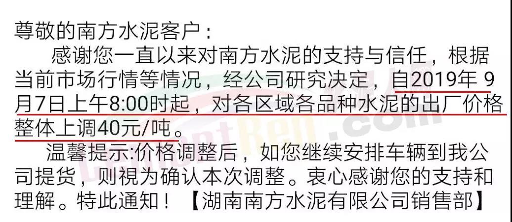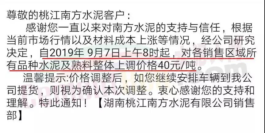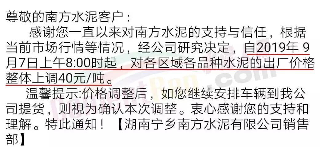 其中,湖南通訊員張玉龍消息稱:昨日(9月7日),湖南寧鄉(xiāng)南方、桃江南方等調(diào)價通知稱,自9月7日8:00起上調(diào)水泥出廠價格,漲幅40元/噸。這是繼上月湖南湘株潭區(qū)域價格上調(diào)后的又一次上調(diào)。