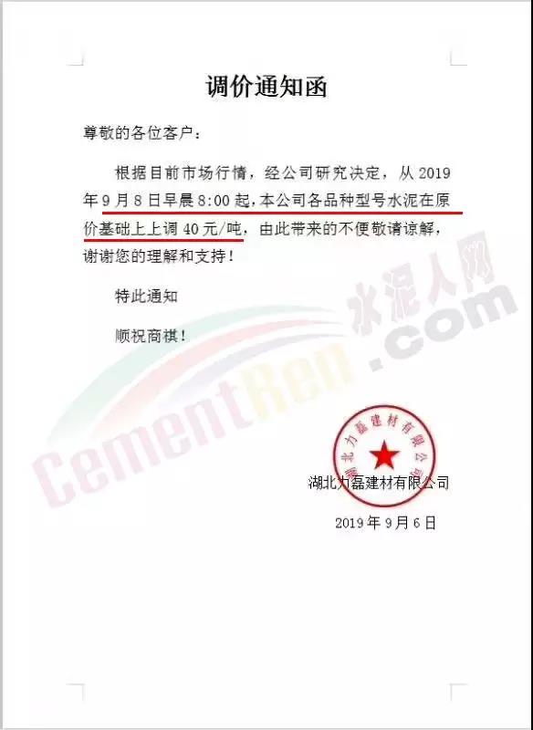 湖北力磊建材有限公司調(diào)價通知函稱,自根據(jù)目前市場行情,經(jīng)公司研究決定自今日(9月8日)早8點起公司各品種型號水泥在原價基礎(chǔ)上上調(diào)40元/噸。