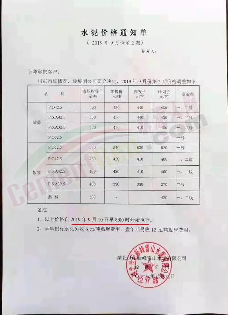 湖北世紀(jì)新峰雷山水泥水泥價格通知單稱自9月10日起執(zhí)行最新價格,基礎(chǔ)熟料市場指導(dǎo)價為500元/噸與計劃價420元相差80元/噸。PO42.5散裝水泥市場指導(dǎo)價480元 /噸,計劃價430元/噸;PO52.5散裝水泥市場指導(dǎo)價550元/噸。