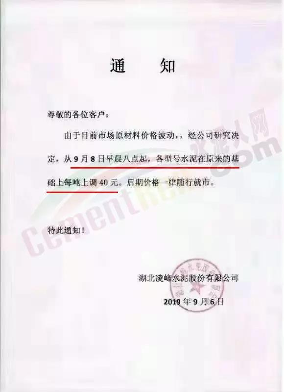 湖北凌峰水泥通知從今日(9月8日)早8點起各型號水泥在原來的基礎(chǔ)上上調(diào)40元/噸。