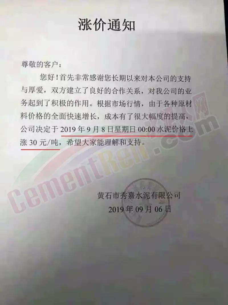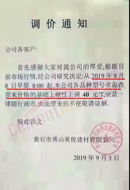 黃石市秀山英俊建材有限公司通知自今日(9月8日)早晨 8時起公司各種型號水泥在原價基礎(chǔ)上硬性上調(diào)40元/噸,余款一律隨行就市。