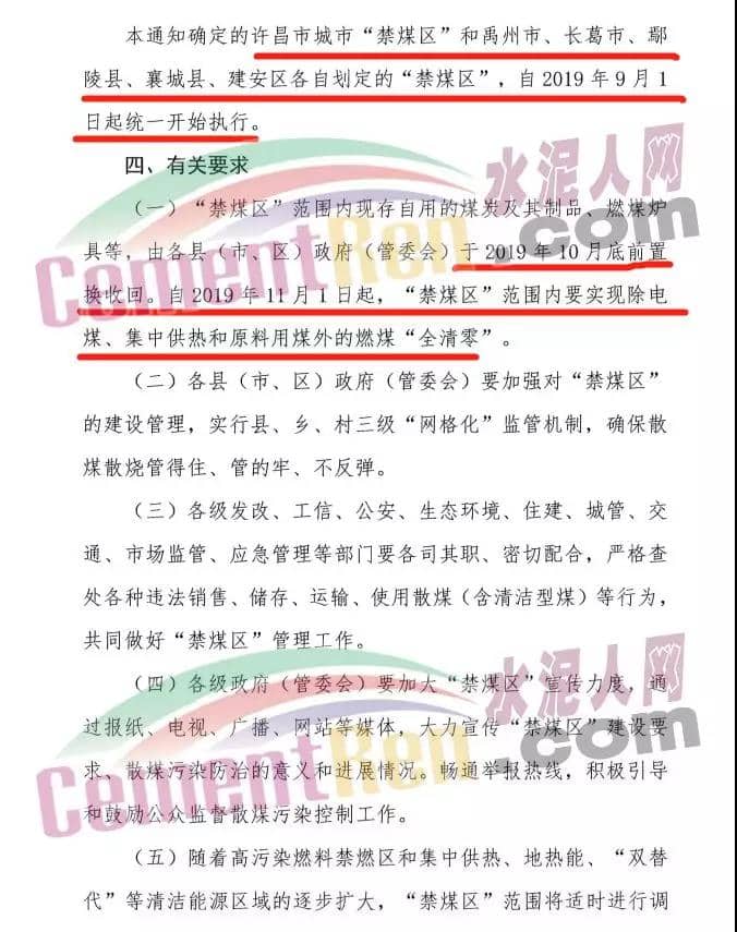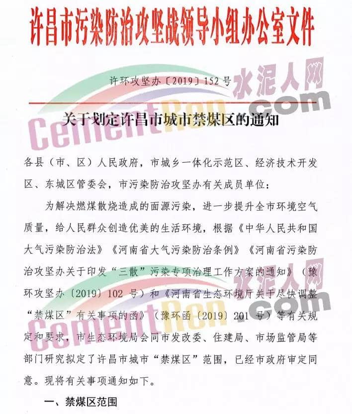 水泥人網消息:日前,河南許昌市大氣污染防治攻堅辦公發(fā)布《關于劃定許昌市城市禁煤區(qū)的通知》,對禁煤區(qū)域的禁煤措施及區(qū)域進行了明確的規(guī)定: