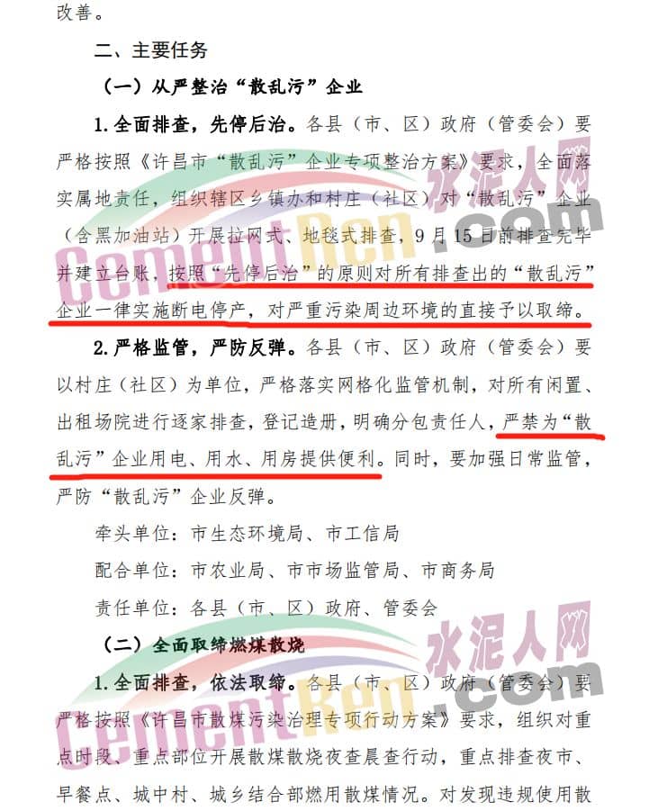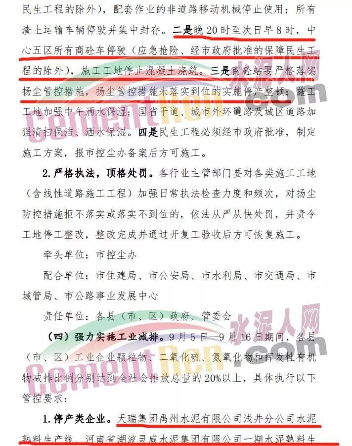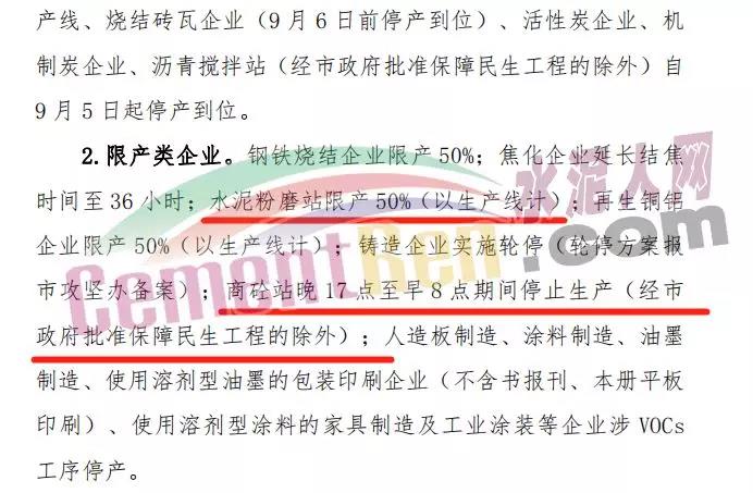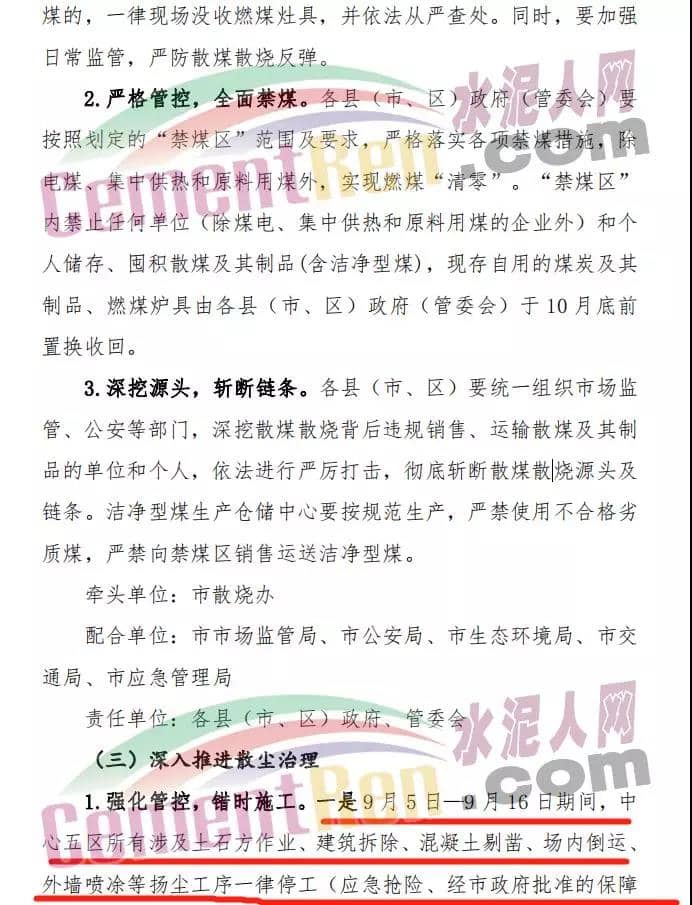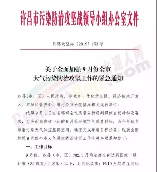 與此同時,許昌市污染防治攻堅戰(zhàn)領導小組發(fā)布關于全面加強9月份全市大氣污染防治攻堅工作的緊急通知,通過對水泥企業(yè)、商砼企業(yè)的停限產有了明確的規(guī)定。部分內容如下: