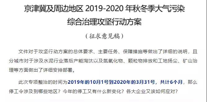 日前,水泥人網(wǎng)轉(zhuǎn)發(fā)了《京津冀及周邊地區(qū)2019-2020 年秋冬季大氣污染綜合治理攻堅(jiān)行動(dòng)方案(征求意見稿)》。并有針對(duì)性的劃出了重點(diǎn)。其中提到國家相關(guān)部門將于2019年的10月1日到2020年的3月31日對(duì)2+26城市進(jìn)行環(huán)境問題專項(xiàng)整治 。(相關(guān)鏈接:“停工令”又來了!為期6個(gè)月!涉及28個(gè)城市!)消息一出,引起廣泛關(guān)注。有網(wǎng)友留言稱,停限產(chǎn)或?qū)?dǎo)致一波水泥價(jià)格上漲。