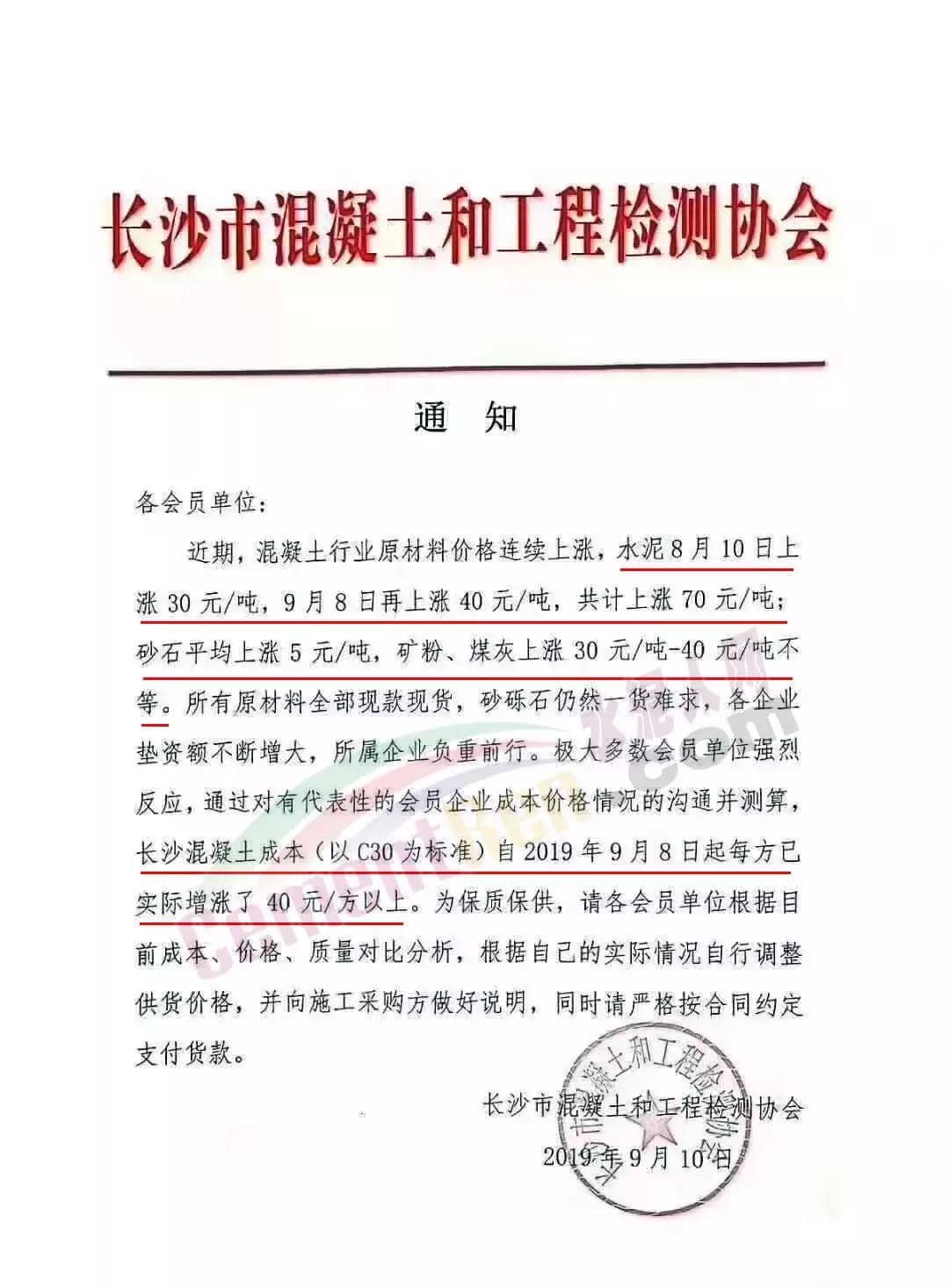 據(jù)水泥人網(wǎng)了解,目前,長沙部分地區(qū)商混價(jià)格通知上調(diào)20-40元/方,目前當(dāng)本地C30含稅非泵送商混到位價(jià)在480-500元/方。據(jù)水泥人網(wǎng)此前報(bào)道,上述文件中提到的水泥漲價(jià)是從8月中下旬開始的,上調(diào)價(jià)格的區(qū)域包括廣西、江西、山東、安徽、陜西、江蘇、浙江、湖南、甘肅、重慶、青海、內(nèi)蒙古、山西等。漲價(jià)伴隨著泥跨區(qū)域銷售“盛行”價(jià)格上漲迅速蔓延至全區(qū)域。就連此前一直處于價(jià)格洼低的貴州市場(chǎng),也已歷了兩波價(jià)格上調(diào),部分企業(yè)已經(jīng)較八月初上漲了100元/噸。這波水泥漲價(jià)涉及多個(gè)省市地區(qū),幾乎覆蓋全國近2000家水泥企業(yè)。國家統(tǒng)計(jì)局近期公布的數(shù)據(jù)顯示九月上旬,非金屬建材領(lǐng)域水泥價(jià)格自6月以來首次出現(xiàn)上行趨勢(shì)。P.O42.5散裝水泥均價(jià)427.6元/噸,上漲1%。P.C32.5袋裝水泥也逆勢(shì)上行,均價(jià)接近了400元/噸。