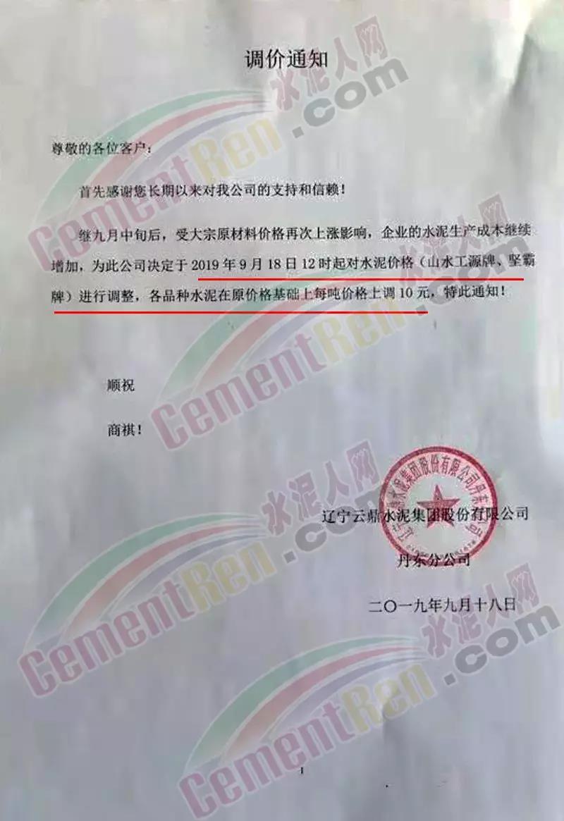 據(jù)了解,上述水泥價(jià)格上漲多因上游原材料礦粉,混合材,以及煤炭價(jià)格上調(diào)導(dǎo)致的成本增加繼而傳導(dǎo)漲價(jià)。亦有部分是政策面因素,停限產(chǎn)導(dǎo)致部分區(qū)域庫位較低,供應(yīng)不足。為保供重點(diǎn)項(xiàng)目,部分企業(yè)上調(diào)了水泥價(jià)格。昨日(9月18日)遼寧云鼎水泥集團(tuán) 股份有限公司發(fā)布調(diào)價(jià)通知稱,繼九月中旬后,受大宗原材料價(jià)格再次上漲影響,企業(yè)的水泥生產(chǎn)成本繼續(xù)增加,為此公司決定于9月18日12時(shí)起對(duì)水泥價(jià)格(山水工源牌、堅(jiān)霸牌)進(jìn)行調(diào)整,各品種水泥在原價(jià)格基礎(chǔ)上每噸價(jià)格上調(diào)10元。