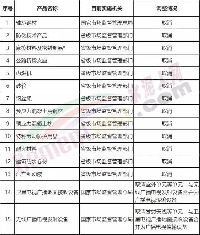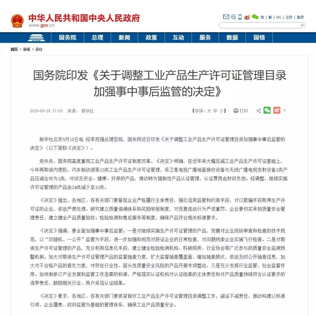 文件稱:黨中央、國務(wù)院高度重視工業(yè)產(chǎn)品生產(chǎn)許可證制度改革。《決定》明確,在近年來大幅壓減工業(yè)產(chǎn)品生產(chǎn)許可證基礎(chǔ)上,今年再取消內(nèi)燃機、汽車制動液等13類工業(yè)產(chǎn)品生產(chǎn)許可證管理,將衛(wèi)星電視廣播地面接收設(shè)備與無線廣播電視發(fā)射設(shè)備2類產(chǎn)品壓減合并為1類,對涉及安全、健康、環(huán)保的產(chǎn)品,推動轉(zhuǎn)為強制性產(chǎn)品認證管理,認證費用由財政負擔。經(jīng)調(diào)整,繼續(xù)實施許可證管理的產(chǎn)品由24類減少至10類?!稕Q定》提出,各地區(qū)、各有關(guān)部門要督促企業(yè)嚴格履行主體責任,強化信用監(jiān)管和約束手段,對以欺騙手段取得生產(chǎn)許可證的企業(yè),依法嚴肅處理。研究建立質(zhì)量追溯體系和獎勵舉報制度,對惡意違法行為嚴懲重罰。企業(yè)要切實承擔質(zhì)量安全管理責任,建立健全產(chǎn)品質(zhì)量驗收、檢驗檢測和售后服務(wù)等制度,確保產(chǎn)品符合相關(guān)標準要求。《決定》強調(diào),要全面加強事中事后監(jiān)管。一是對繼續(xù)實施生產(chǎn)許可證管理的產(chǎn)品,完善對企業(yè)現(xiàn)場審查和檢查的技術(shù)規(guī)范,以“雙隨機、一公開”監(jiān)管為手段,進一步加強和規(guī)范對獲證企業(yè)的日常檢查,對問題線索企業(yè)實施飛行檢查。二是對取消生產(chǎn)許可證管理的產(chǎn)品,充分利用信息化手段,建立健全檢驗檢測機構(gòu)、科研院所、行業(yè)協(xié)會等廣泛參與的質(zhì)量安全監(jiān)測預(yù)警機制。加大對取消生產(chǎn)許可證管理產(chǎn)品的監(jiān)督抽查力度,擴大監(jiān)督抽查覆蓋面,增加抽查頻次,依法及時公開抽查信息,加大對不合格產(chǎn)品的查處力度,對存在行業(yè)性、苗頭性質(zhì)量安全風險的產(chǎn)品開展專項整治。三是充分發(fā)揮行業(yè)監(jiān)管、社會監(jiān)督作用。加快制修訂產(chǎn)業(yè)發(fā)展和監(jiān)管工作急需的標準,嚴格落實認證機構(gòu)對認證結(jié)果的主體責任和對產(chǎn)品質(zhì)量持續(xù)符合認證要求的連帶責任,鼓勵相關(guān)行業(yè)、用戶采信認證結(jié)果。