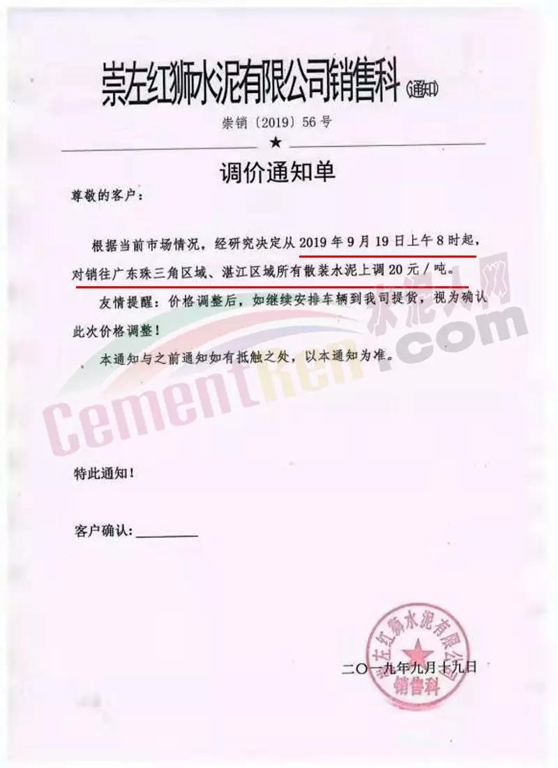 水泥人網消息:日前,崇左紅獅水泥銷售科通知:自明日(9月19日)上午8時起對銷往廣東珠三角、湛江區(qū)域區(qū)域所有散裝水泥上調20元/噸。