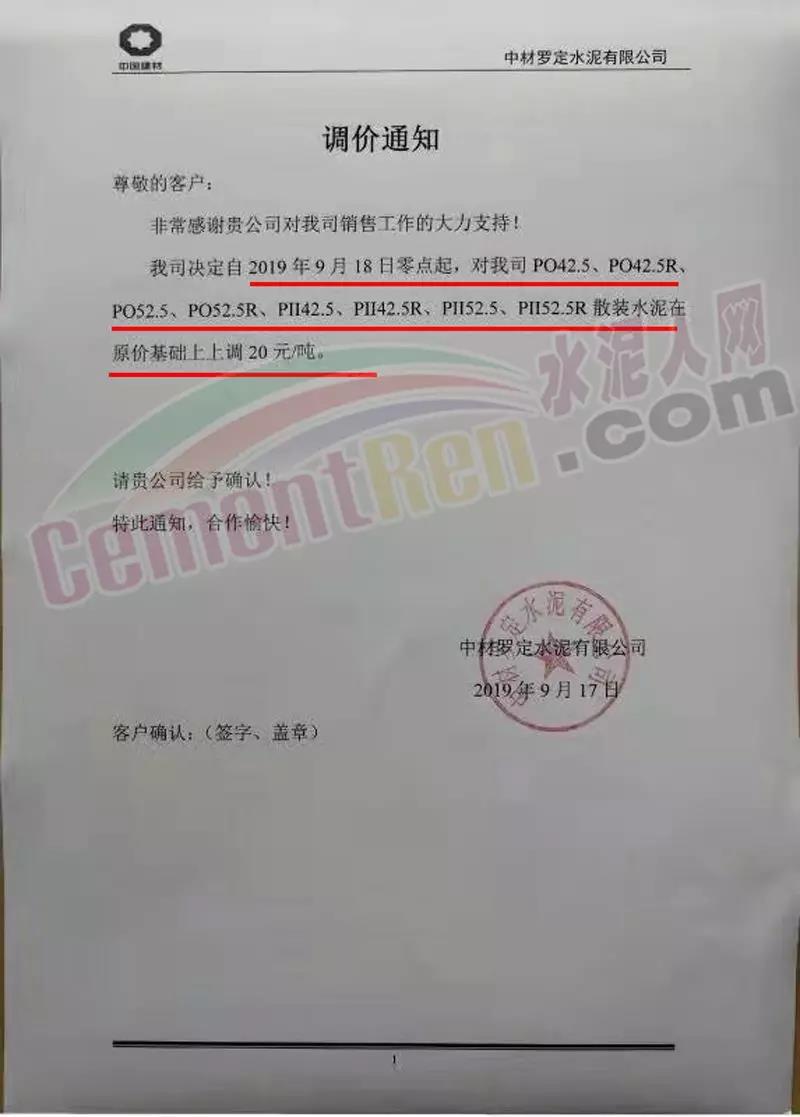 同期,華南區(qū)域主導企業(yè)華潤水泥、臺泥水泥、塔牌水泥、中材水泥等通知上調水泥價格,漲幅20元/噸。 中材羅定水泥有限公司自9月18日零點起PO42.5以以上標號散裝水泥在原價基礎上上調20元/噸。