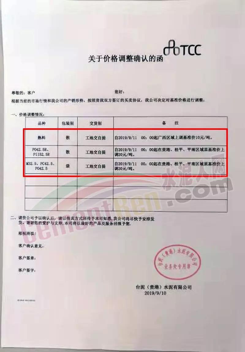 臺泥(貴港)水泥有限公司自9月11日零時起熟料上調10元/噸。PO42.5以及上標號水泥上調20元/噸。