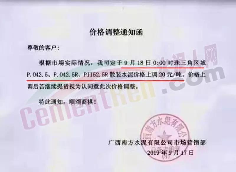 廣西南方水泥有限公司通知9月18日0時起對珠三角區(qū)域PO42.5及以上高標號散裝水泥價格上調20元/噸。