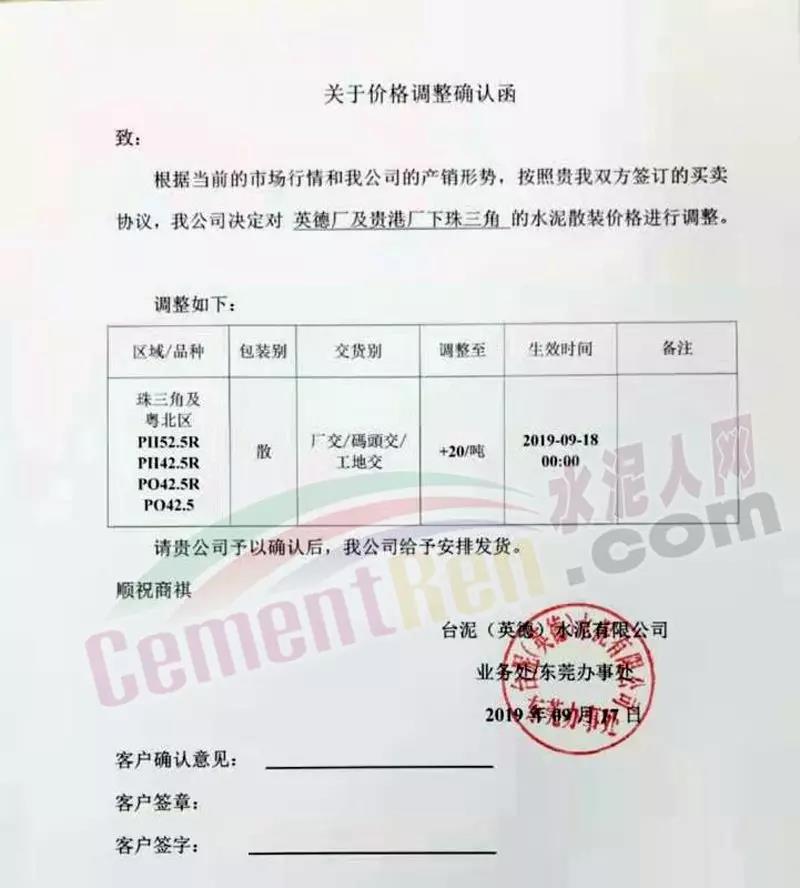 臺泥(英德)水泥有限公司通知自9月18日0時起對珠三角及粵北區(qū)域PO42.5及以上標號散裝水泥上調20元/噸。