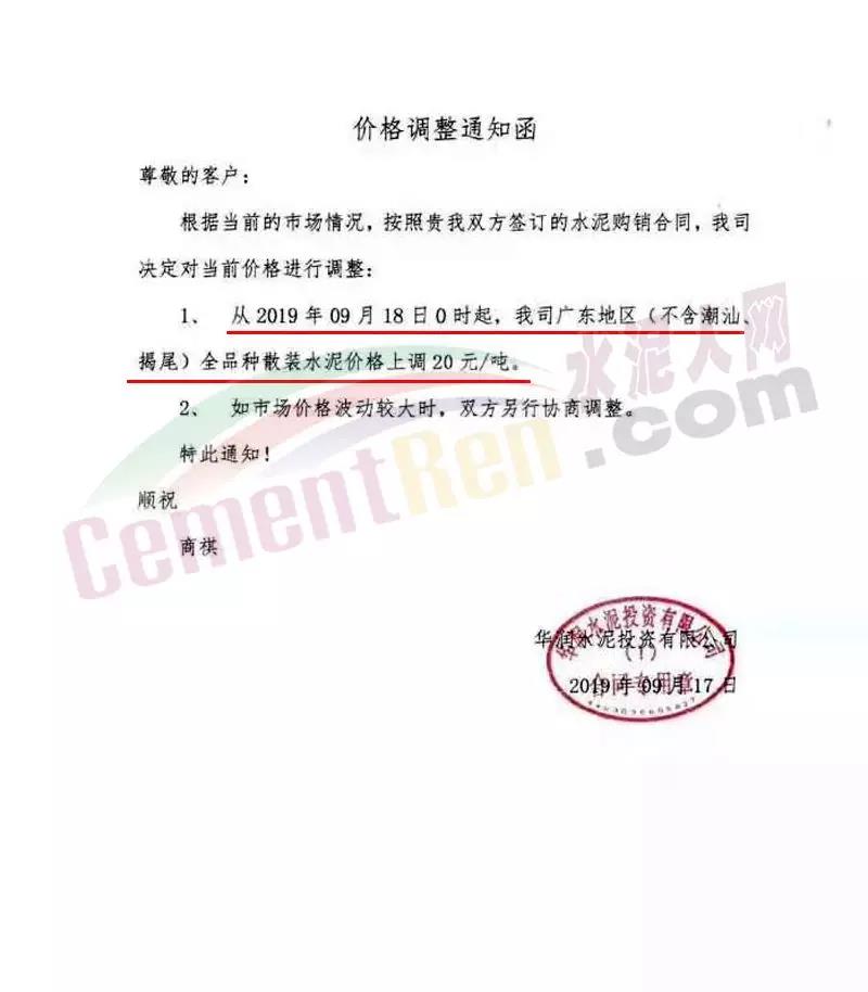 華潤水泥投資有限公司通知 從9月18日0時起廣東地區(qū)(不含潮汕、揭尾)全品種散裝水泥價格上調20元/噸。