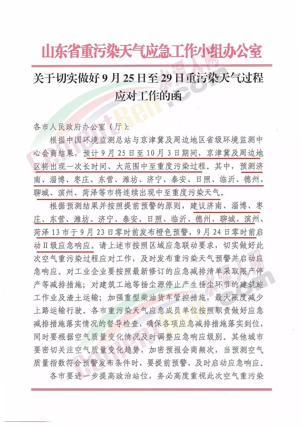 山東省13個市今日零點前啟動大氣應(yīng)急方案!水泥企業(yè)停限產(chǎn)!山東省重污染天氣應(yīng)急工作小組辦公室《關(guān)于切實做好9月25日至29日重污染天氣過程應(yīng)對工作的函》稱:預(yù)計9月25日至10月3日期間,京津冀及周邊地區(qū)將出現(xiàn)一次長時間、大范圍中至重度污染過程。其中預(yù)測濟(jì)南、淄博、棗莊、濟(jì)寧、泰安、日照、荷澤等13市將連續(xù)出現(xiàn)中至重度污染天氣,根據(jù)預(yù)測結(jié)果并按照提前預(yù)警的原則,建議濟(jì)南、淄博、棗莊、東營、濰坊、濟(jì)寧、泰安、日照、臨沂、德州、聊城、濱州、荷澤13市于今日(9月23日)零時前啟動II級應(yīng)急響應(yīng)。并請上述13市按照區(qū)域應(yīng)急聯(lián)動要求,切實做好此次空氣重污染過程應(yīng)對工作。對工業(yè)企業(yè)要按照最新修訂的應(yīng)急減排清單采取限產(chǎn)停產(chǎn)等減排措施。對建筑工地?fù)P塵源停止產(chǎn)生揚塵環(huán)節(jié)的建筑施工作業(yè)及渣土運輸;加強(qiáng)重型柴油車管控措施,最大限度減少上路運輸行駛。