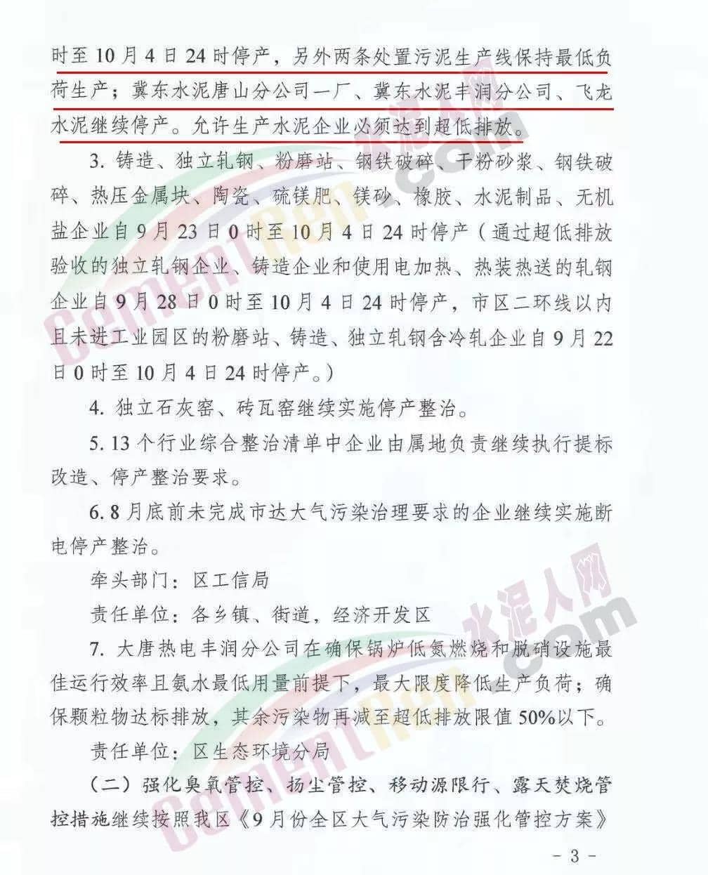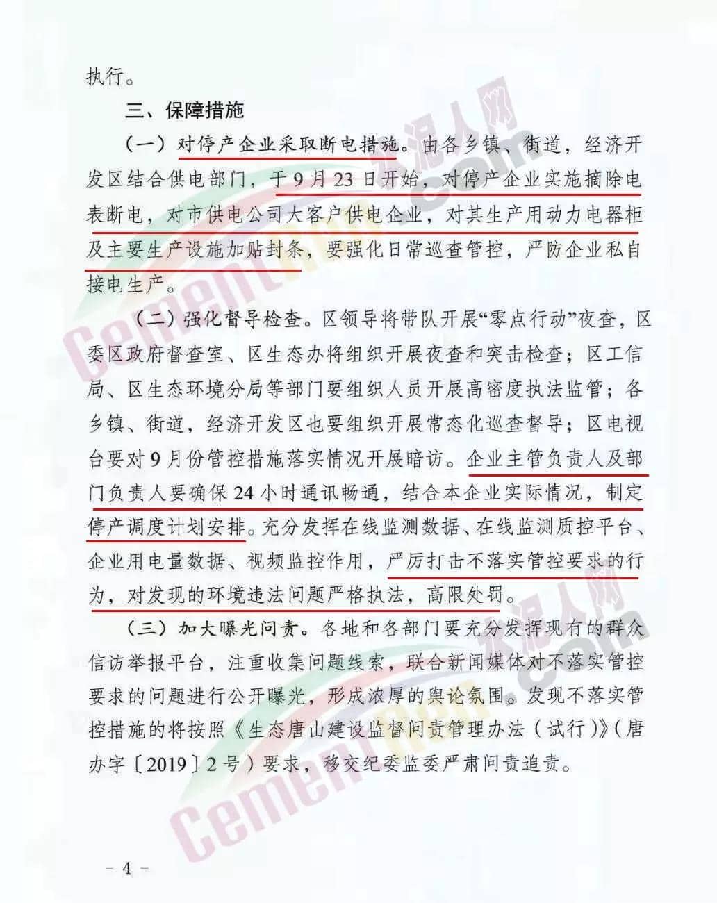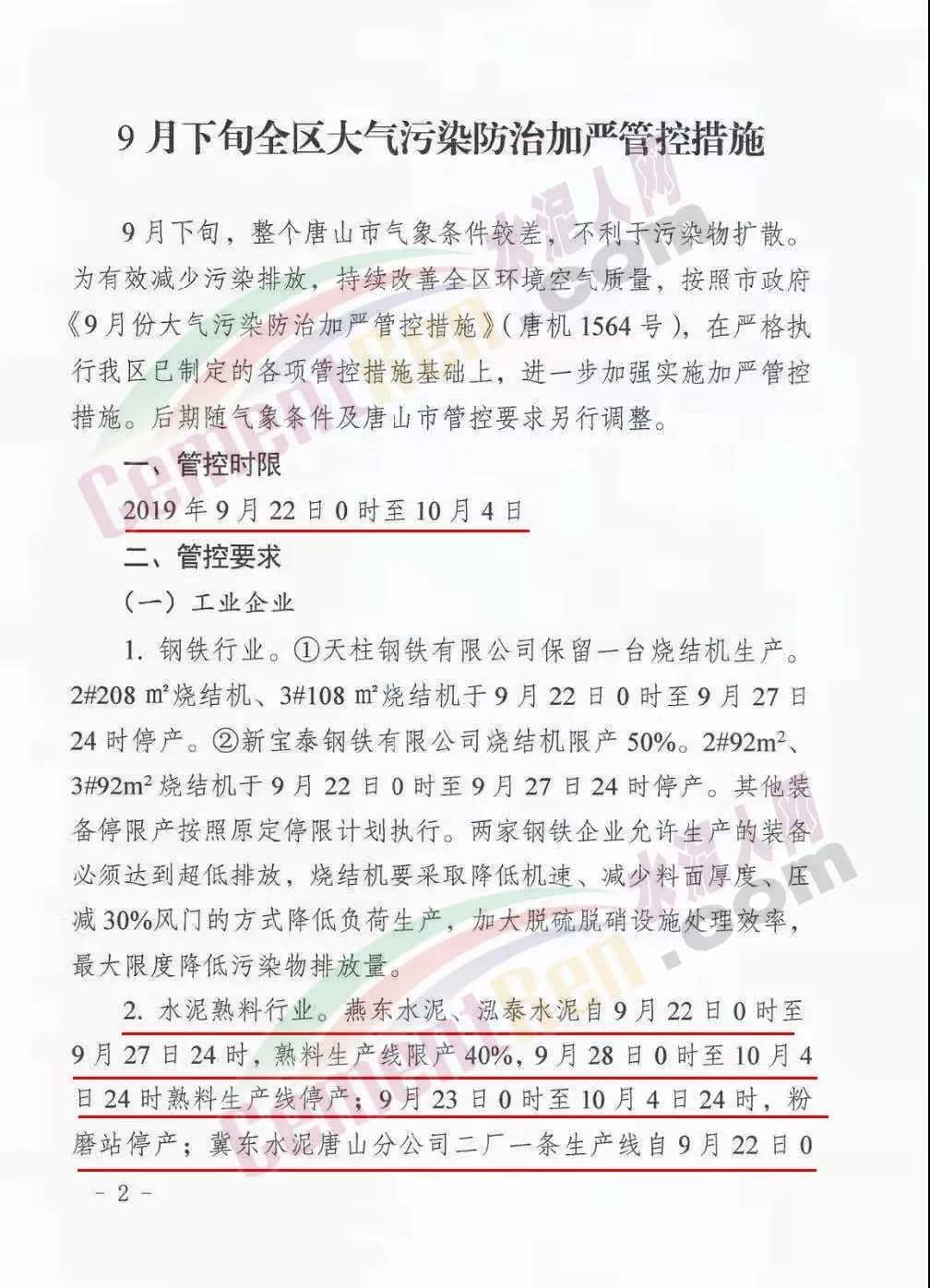 管控時限:2019年9月22日0時至10月4日水泥熟料行業(yè):一、燕東水泥、泓泰水泥自9月22日0時至9月27日24時,熟料生產(chǎn)線限產(chǎn)40%,9月28日0時至10月4日24時熟料生產(chǎn)線停產(chǎn);9月23日0時于10月4日24時,粉磨站停產(chǎn);二、冀東水泥唐山分公司二廠一條生產(chǎn)線自9月22日0時至10月4日24時停產(chǎn),另外兩條處置污泥生產(chǎn)線保持最低負(fù)荷生產(chǎn);三、冀東水泥唐山分公司一廠、冀東水泥豐潤分公司、飛龍水泥繼續(xù)停產(chǎn)。允許生產(chǎn)的水泥企業(yè)必須達(dá)到超低排放。對于停產(chǎn)企業(yè)采取斷電措施,由各鄉(xiāng)鎮(zhèn)、街道、經(jīng)濟(jì)開發(fā)區(qū)結(jié)合供電部門,于9月23日開始,對停產(chǎn)企業(yè)實施摘除電表斷電,對市供電公司大客戶供電企業(yè),對其生產(chǎn)用動力電器柜及主要生產(chǎn)設(shè)施加貼封條,要強(qiáng)化日常巡查管控,嚴(yán)防企業(yè)私自接電生產(chǎn)。強(qiáng)化督導(dǎo)檢查期間,區(qū)領(lǐng)導(dǎo)將帶隊開展“零點行動”夜查,區(qū)委區(qū)政府督查室、區(qū)生態(tài)辦將組織開展夜查和突擊檢查等,區(qū)電視臺要對9月份管控措施落實情況開展暗訪。企業(yè)主管負(fù)責(zé)人及部分負(fù)責(zé)人要確保24小時通訊申通,結(jié)合本企業(yè)實際情況,制定停產(chǎn)調(diào)度計劃安排。嚴(yán)厲打擊不落實管控要求的行為,對發(fā)現(xiàn)的環(huán)境違法問題嚴(yán)格執(zhí)法,高限處罰?!?月下旬大氣污染防治加嚴(yán)管控措施》全文如下: