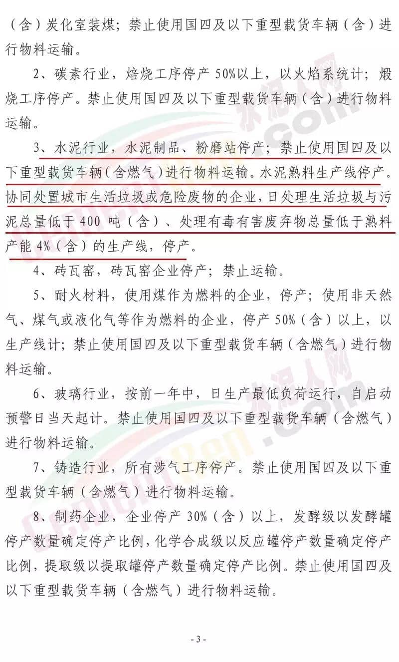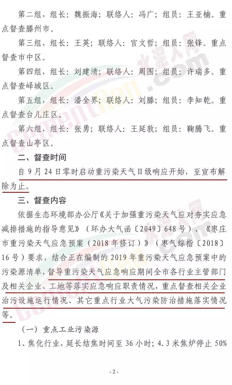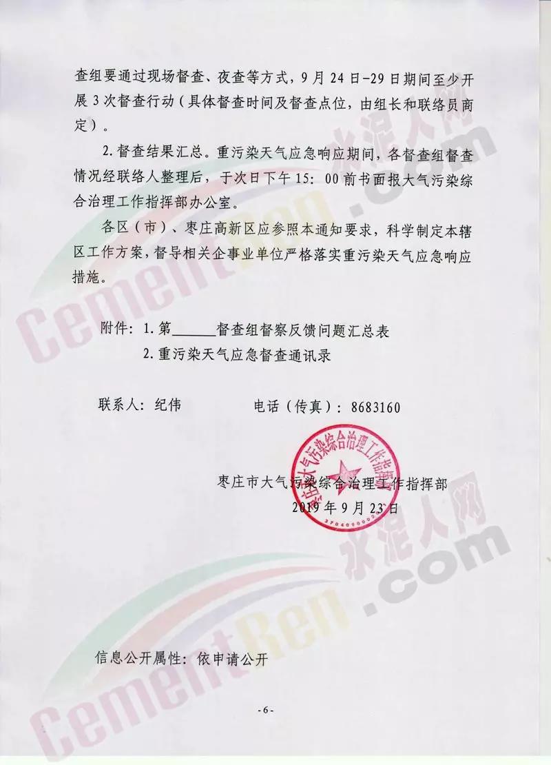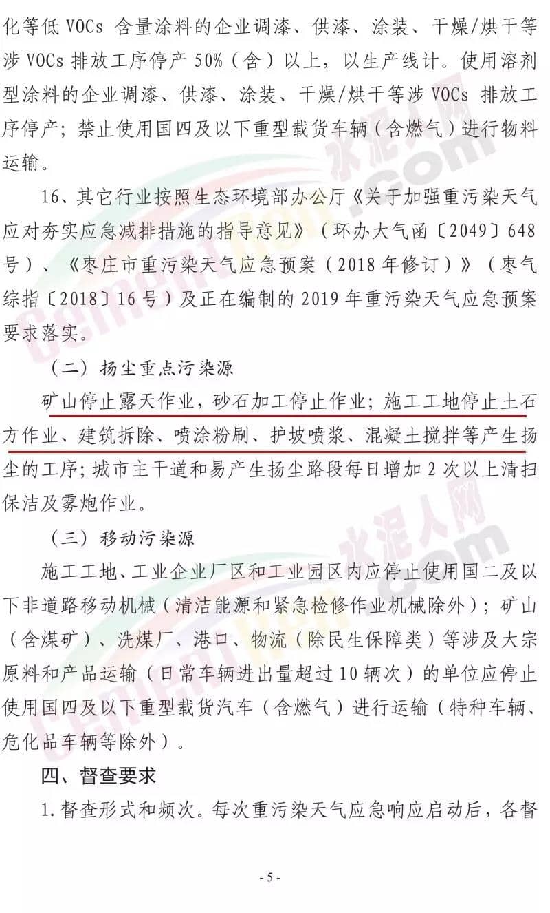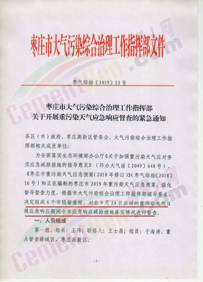 日前,山東省棗莊市大氣污染綜合治理工作指揮部發(fā)布《關(guān)于開(kāi)展重污染天氣應(yīng)急響應(yīng)督查的緊急通知》稱將組成6個(gè)市級(jí)督查組,對(duì)9月24日啟動(dòng)的重污染天氣II級(jí)應(yīng)急響應(yīng)期間全市應(yīng)急響應(yīng)減排措施落實(shí)情況進(jìn)行督查。水泥行業(yè),水泥制品,粉磨站停產(chǎn);禁止使用國(guó)四及以下重型載貨車輛(含 燃?xì)?進(jìn)行物料運(yùn)輸。水泥熟料生產(chǎn)線停產(chǎn)。協(xié)同處置城市生活垃圾或危廢的企業(yè),日處理生活垃圾與污泥總量低于400噸(含)、處理有毒有害廢棄物總量低于熟料產(chǎn)能4%(含)的生產(chǎn)線停產(chǎn)。通知原文如下: