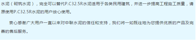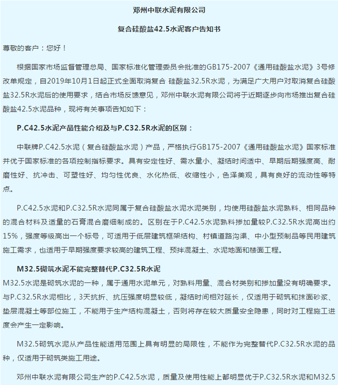 據(jù)水泥人網(wǎng)區(qū)域通知員反饋,繼西峽中聯(lián)水泥發(fā)布新品客戶告知書(shū)后,近日鄧州中聯(lián)水泥也發(fā)布了復(fù)合硅酸鹽42.5水泥客戶告知書(shū)以替代即將取消的PC32.5R水泥。鄧州中聯(lián)水泥客戶告知書(shū)如下:
