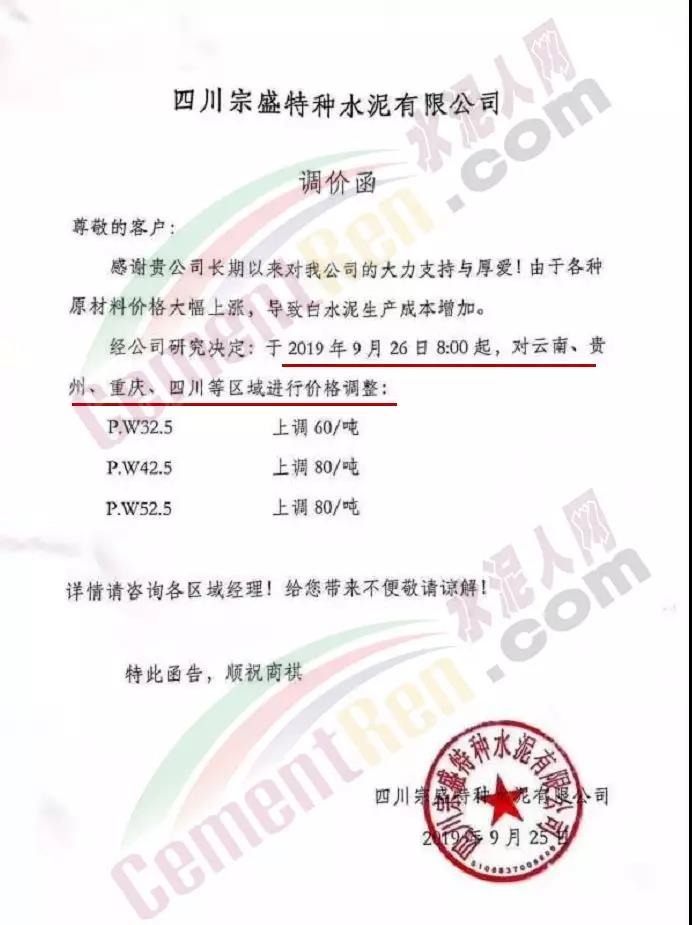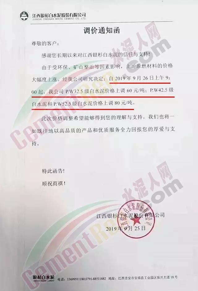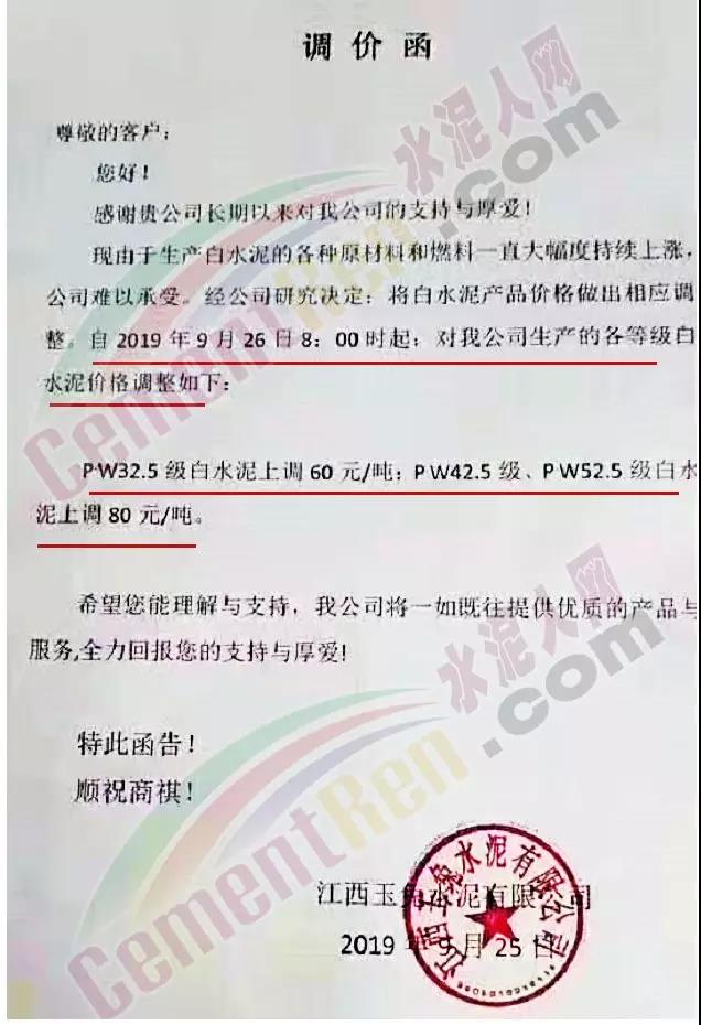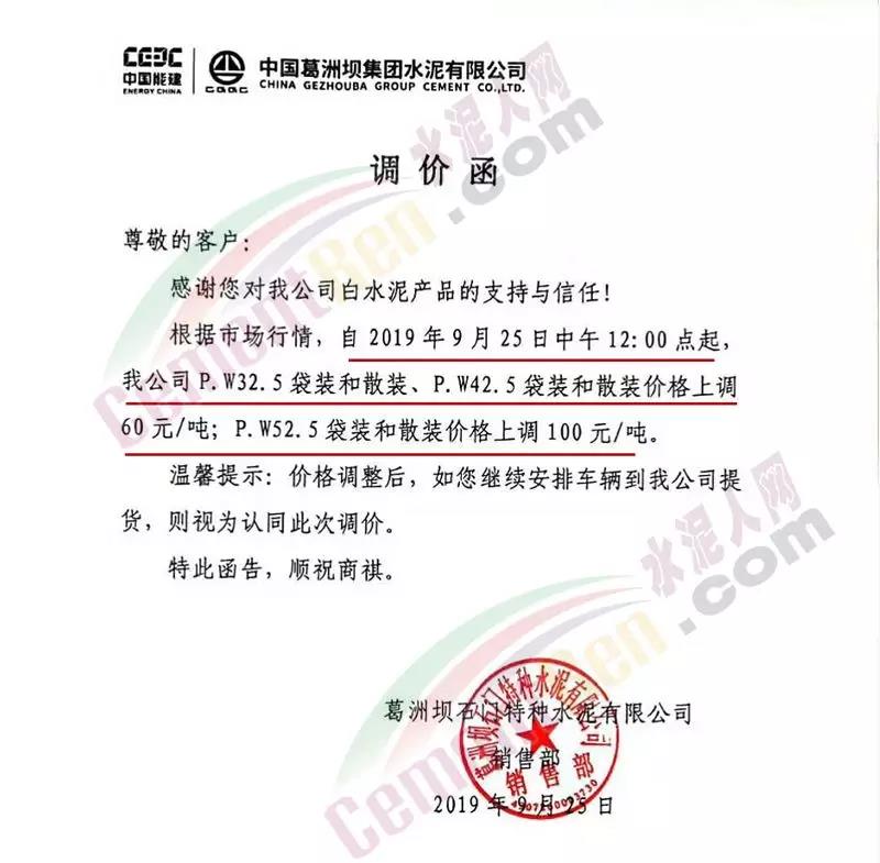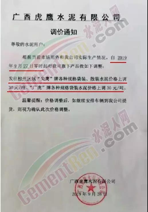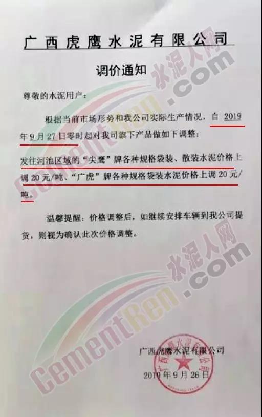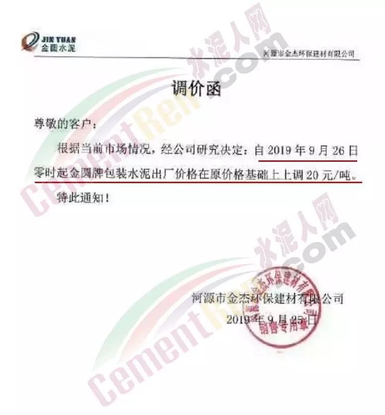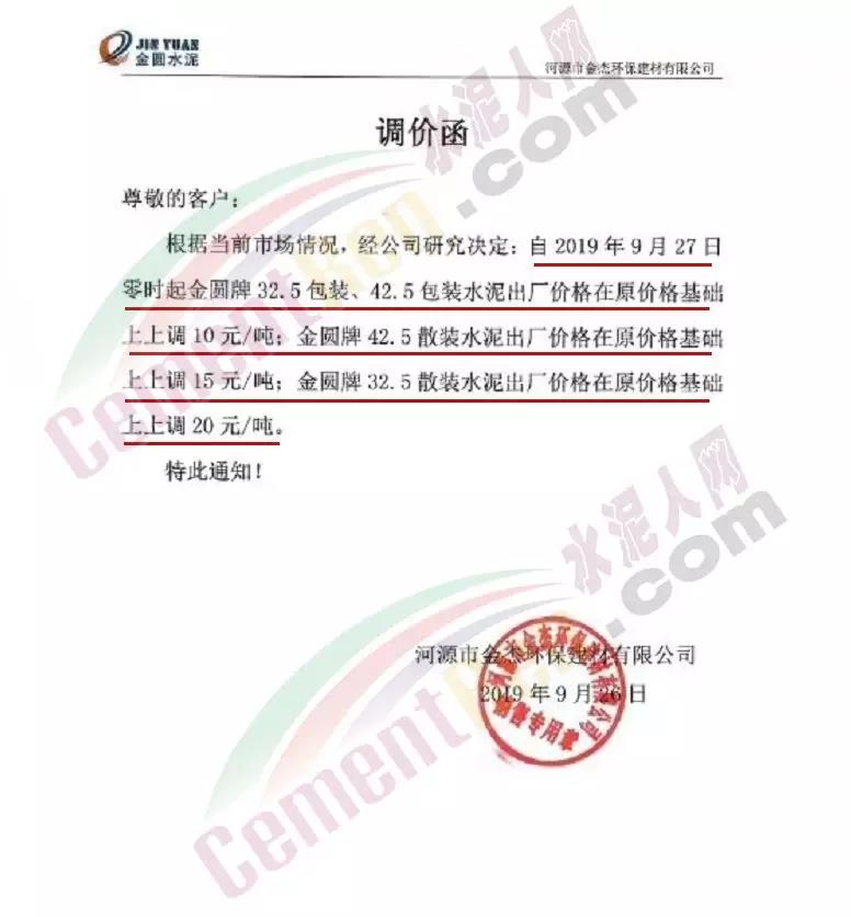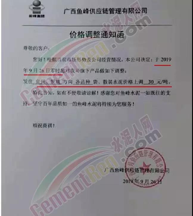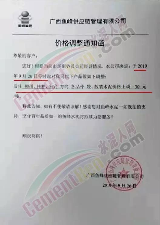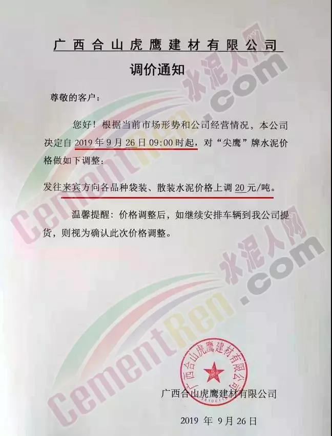 根據(jù)當前市場形勢及我司生產(chǎn)情況,我公司決定于2019年9月26日8時,上調(diào)所有品種袋裝、散裝水泥價格30元/噸。價格上調(diào)以我司出廠過磅時間為準,如您繼續(xù)安排提貨,則視為認同此次價格調(diào)整。順祝商祺!