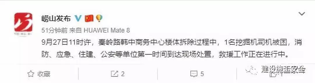 微博內(nèi)容截圖據(jù)嶗山發(fā)布官方微博發(fā)布消息稱,9月27日11時(shí)許,青島市嶗山區(qū)秦嶺路韓中商務(wù)中心樓體拆除過程中,1名挖掘機(jī)司機(jī)被困,消防、應(yīng)急、住建、公安等單位第一時(shí)間到達(dá)現(xiàn)場處置,救援工作正在進(jìn)行中。 據(jù)知情人透露,該項(xiàng)目的拆除工作是由和達(dá)集團(tuán)進(jìn)行施工,現(xiàn)場突發(fā)意外整個(gè)樓體瞬間崩塌,挖掘機(jī)被埋。事故現(xiàn)場正進(jìn)行多方救援