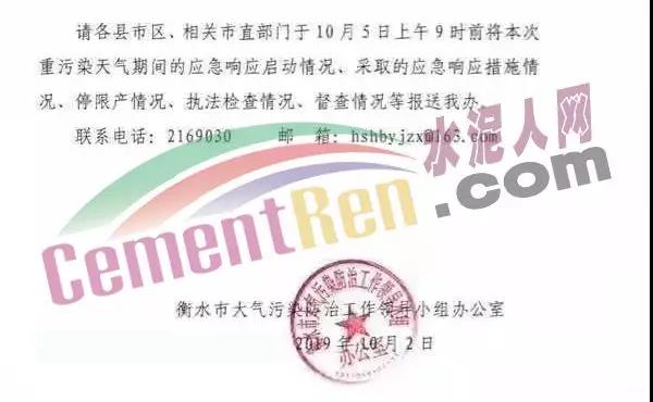 據(jù)水泥人網(wǎng)消息,衡水市大氣污染防治工作領(lǐng)導(dǎo)小組辦公室發(fā)布《關(guān)于解除重污染天氣II級(橙色)應(yīng)急響應(yīng)的通知》稱,根據(jù)《關(guān)于解除重污染天氣II級應(yīng)急響應(yīng)的通知》(冀氣領(lǐng)辦【2019】195號)的精神,經(jīng)省環(huán)境應(yīng)急與重污染天氣預(yù)警中心與中國環(huán)境監(jiān)測總站、省環(huán)境氣象中心聯(lián)合會商,預(yù)計10月3日夜間起,西北冷空氣自北向南影響河北省,污染逐步清除。預(yù)計4日衡水市本次污染過程基本結(jié)束,按上級要求,經(jīng)衡水市大氣污染防治工作領(lǐng)導(dǎo)小組批準(zhǔn),衡水市定于10月4日8時解除本次重污染天氣應(yīng)急響應(yīng)?! ≡娜缦拢?img alt="" src="http://www.bydzxy.com/uploadfile/2019/1008/20191008042054297.jpg" />