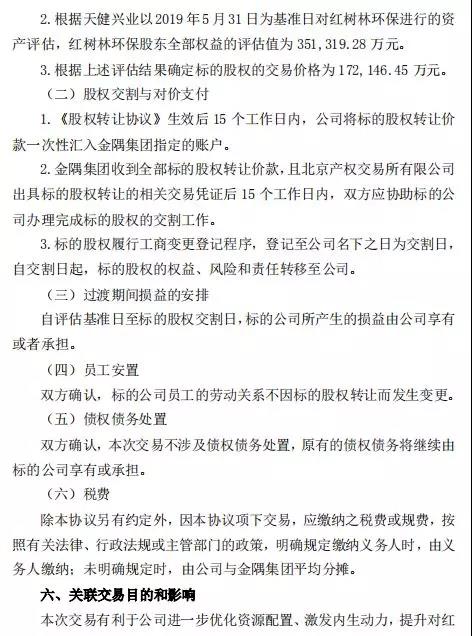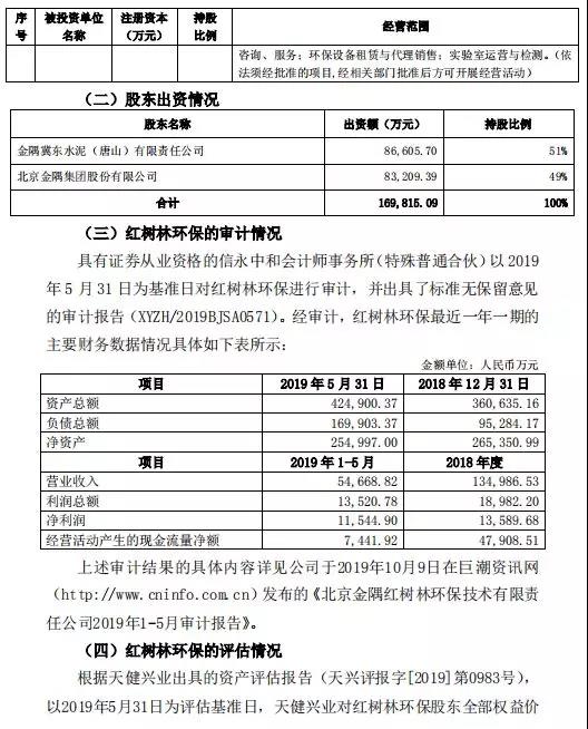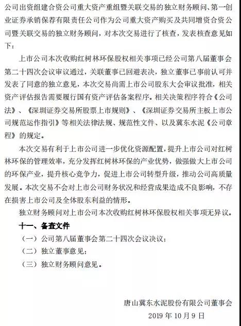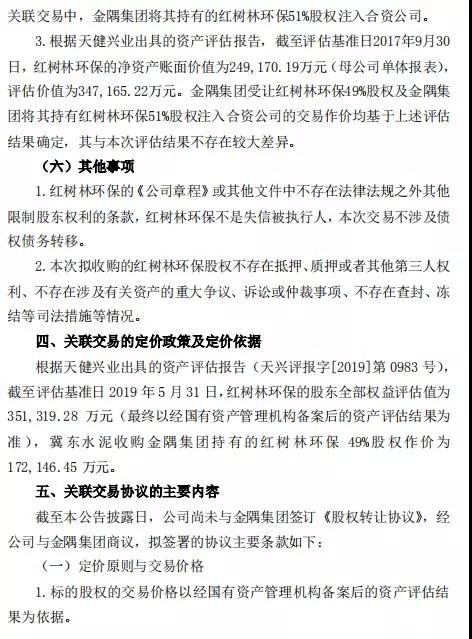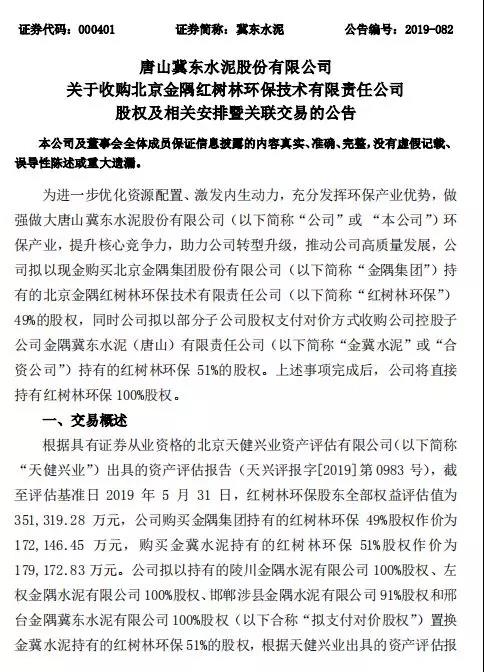 冀東水泥公告,擬現(xiàn)金收購金隅集團(tuán)持有的紅樹林環(huán)保49%股權(quán),同時(shí)擬以部分子公司股權(quán)支付對(duì)價(jià)方式收購控股子公司金冀水泥持有的紅樹林環(huán)保51%股權(quán)。交易完成后,冀東水泥將直接持有紅樹林環(huán)保100%股權(quán)。公告全文如下:
