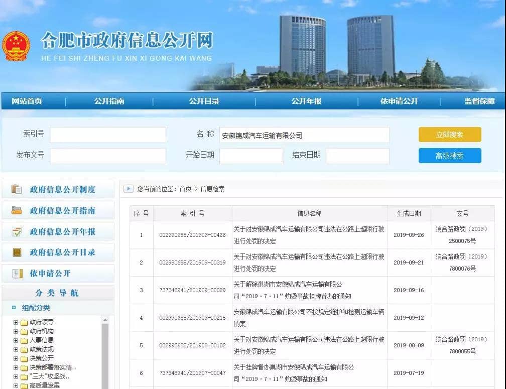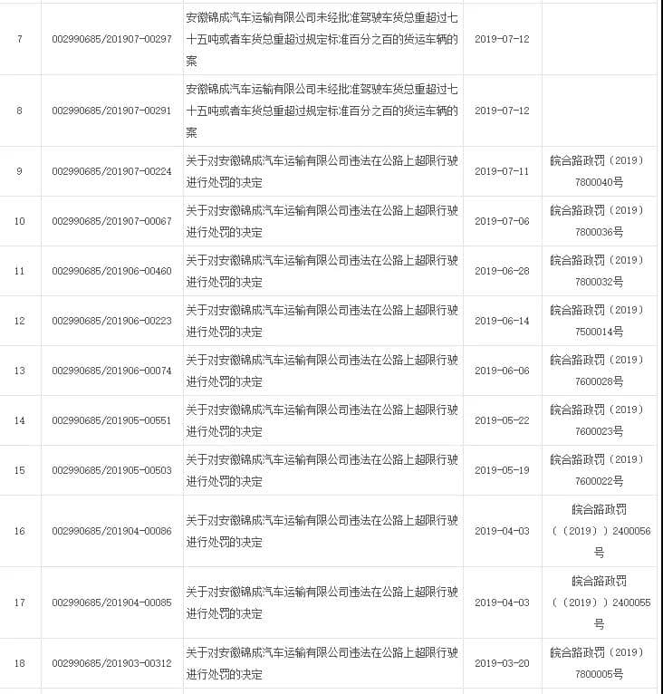 據(jù)安徽省合肥市政府信息公開網(wǎng)信息顯示,近兩個(gè)月來(lái)涉事企業(yè)安徽錦成汽車運(yùn)輸有限公司被處罰多次。自8月9日以來(lái),上述企業(yè)的運(yùn)砂車已經(jīng)連續(xù)三次因超限被罰,罰款合計(jì)九萬(wàn)元,超限率分別為63.67%、70.91%、193.02%。