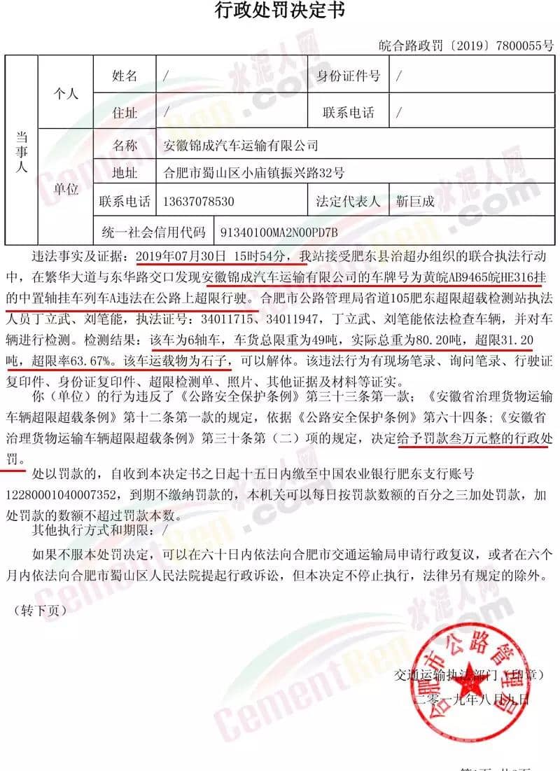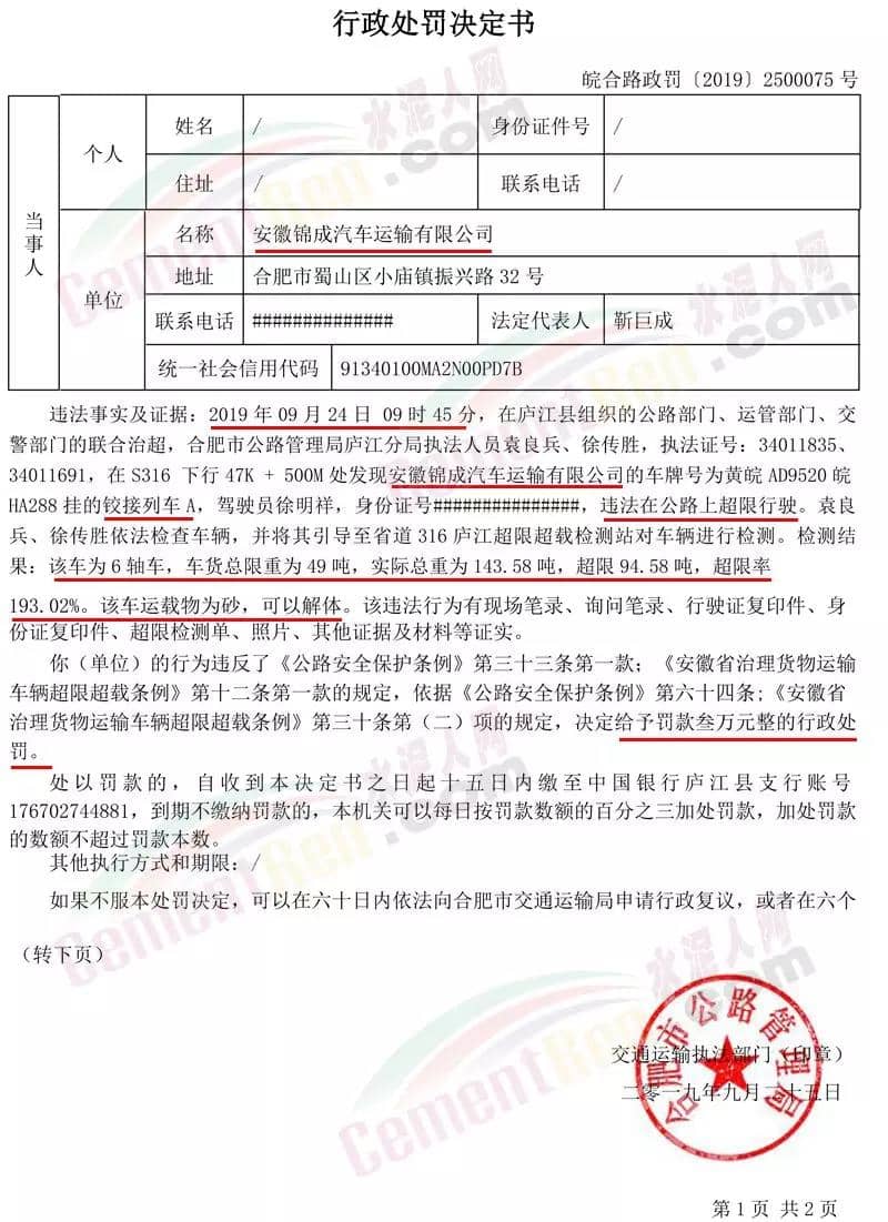 9月26日生效的《關(guān)于對(duì)安徽錦成汽車運(yùn)輸有限公司違法在公路上超限行駛進(jìn)行處罰的決定》(皖合路政罰〔2019〕2500075號(hào))提到2019年09月24日09時(shí)45分,在廬江縣組織的公路部門、運(yùn)管部門、交警部門的聯(lián)合治超,合肥市公路管理局廬江分局執(zhí)法人員發(fā)現(xiàn)安徽錦成汽車運(yùn)輸有限公司的車牌號(hào)為黃皖A(yù)D9520皖HA288掛的鉸接列車A,違法在公路上超限行駛。執(zhí)法人員依法檢查車輛,并將其引導(dǎo)至省道316廬江超限超載檢測(cè)站對(duì)車輛進(jìn)行檢測(cè)。檢測(cè)結(jié)果:該車為6軸車,車貨總限重為49噸,實(shí)際總重為143.58噸,超限94.58噸,超限率193.02%。該車運(yùn)載物為砂,可以解體。上述行為違反了《公路安全保護(hù)條例》第三十三條第一款;《安徽省治理貨物運(yùn)輸車輛超限超載條例》第十二條第一款的規(guī)定,依據(jù)《公路安全保護(hù)條例》第六十四條;《安徽省治理貨物運(yùn)輸車輛超限超載條例》第三十條第(二)項(xiàng)的規(guī)定,決定給予相關(guān)企業(yè)罰款叁萬(wàn)元整的行政處罰。